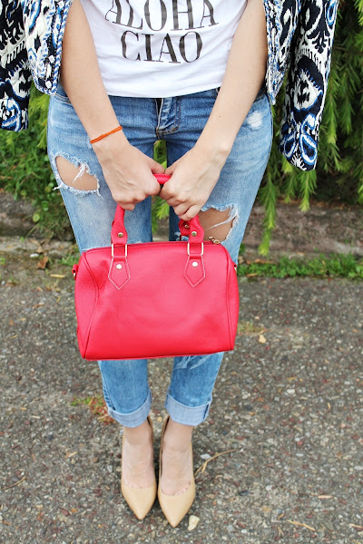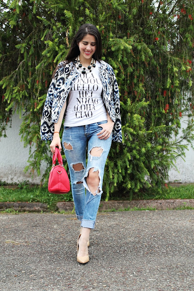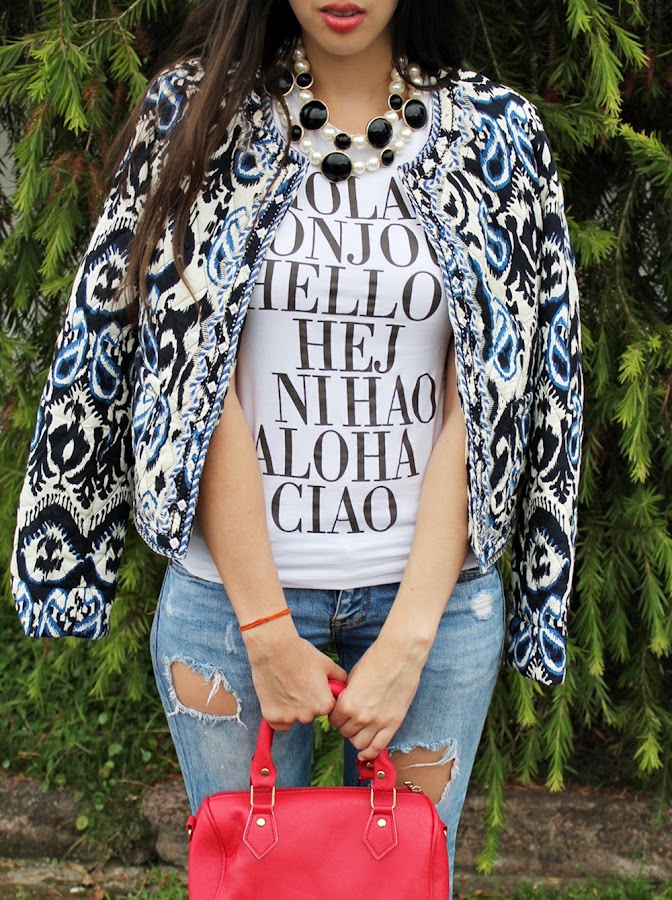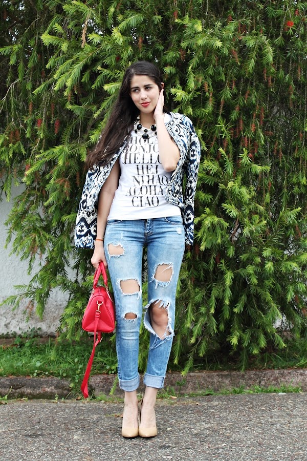 Ahora hablando un poquito de el look de hoy, es un outfit que normalmente puedo usar para hacer diligencias sin dejar de lado el toque chic, la primera pieza que tome en mi closet para armarlo fue la franela Saintsclothes yo soy fiel seguidora de las franelas gráficas y siento que se han vuelto una parte primordial en el closet de cualquier amante de la moda, en Venezuela tenemos opciones preciosas y a muy buen precio como estas de Saints decidí usarla con mi chaqueta favorita de todo los tiempos de Shein, lo que más me gusta es que hace que cualquier look pase de modesto a extraordinario, un par de jeans rotos, tacones color nude para estilizar la figura, bolso rojo para variar los colores y el toque final es el precioso maxi collar de Aishop.