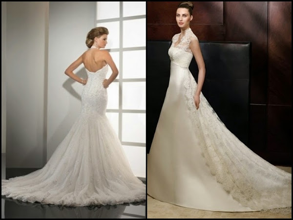 Si la boda fuera la mía, buscaría un vestido de corte sirena, con mucha cola y probablemente con cuello halter de encaje y espalda al descubierto (los escotes en la espalda me parecen mucho más sexys y elegantes que un escote delantero).