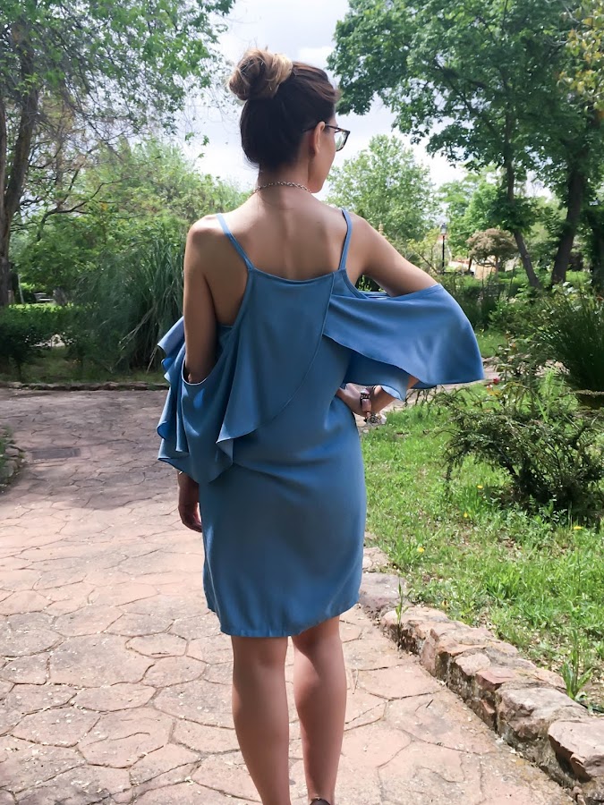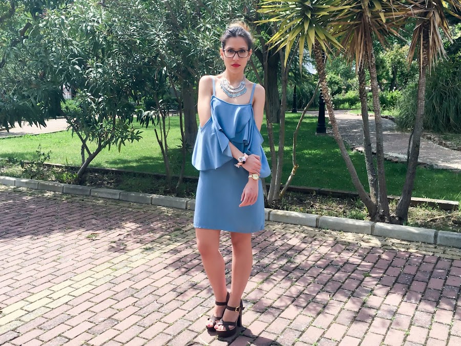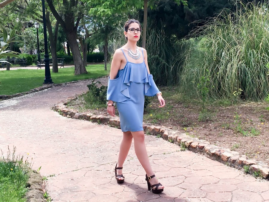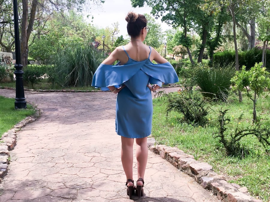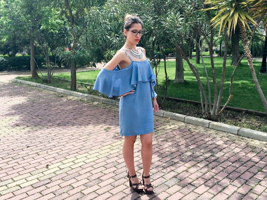 Sin duda, este verano se llevan los hombros descubiertos y si además, añades volantes, mejor que mejor!! El vestido de hoy es impresionante! Nada más verlo, me enamoré de él! De hombros descubiertos y con un volante en el pecho que sienta genial (sobre todo a las que no tenemos mucho pecho!) y que llega hasta la espalda. Además, el color en un azul bebé es súper dulce y con un pequeño estampado de pequeños lunares blancos.