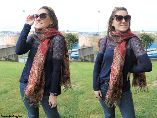El color burdeos lo dejé para un segundo plano en lo complementos, tanto en el bolso entrelazado, ideal para llevar de mano, bandolera o al hombro y el fular de estampado pasley.