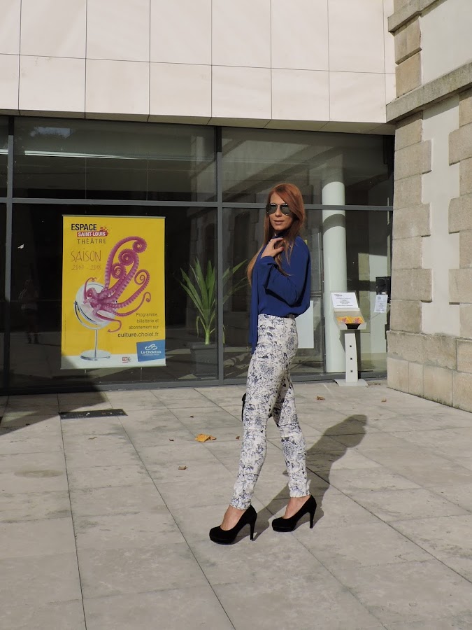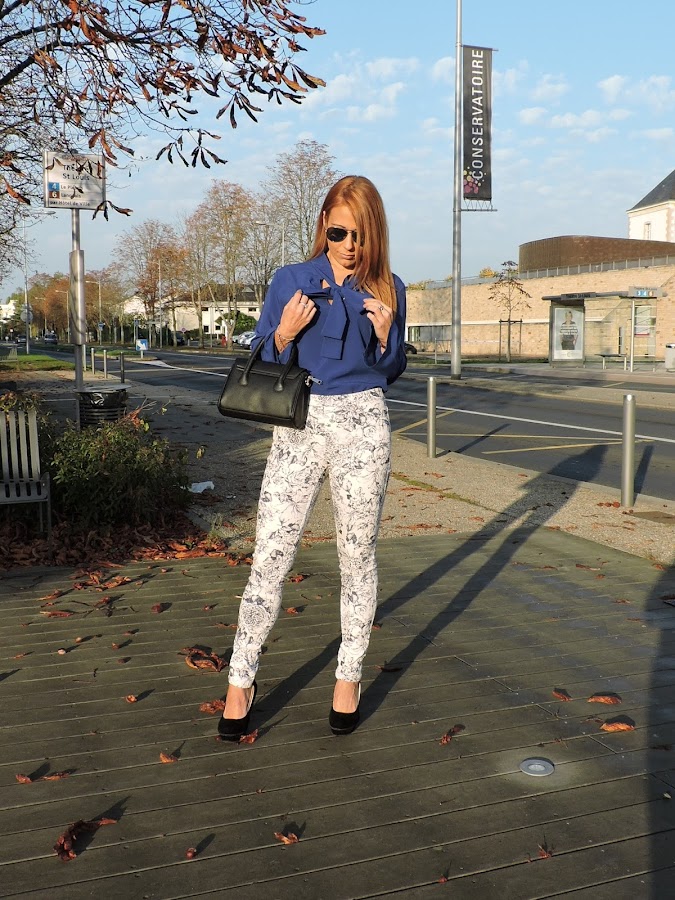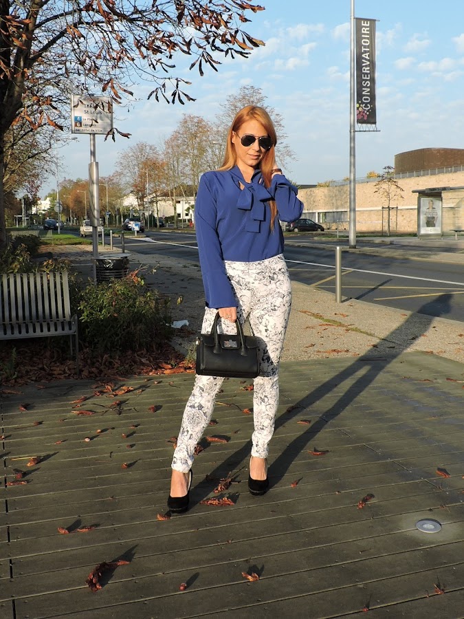 Hoy os propongo un outfit sencillo y elegante, gracias a esta blusa azul klein, este color es super favorecedor tanto para rubias como para morenas ademas es un color muy sencillo de combinar a mi me gusta mucho combinarlo con negro, aunque esta vez he optado por unos pantalones en blanco con motivo azules y accesorios en negro.