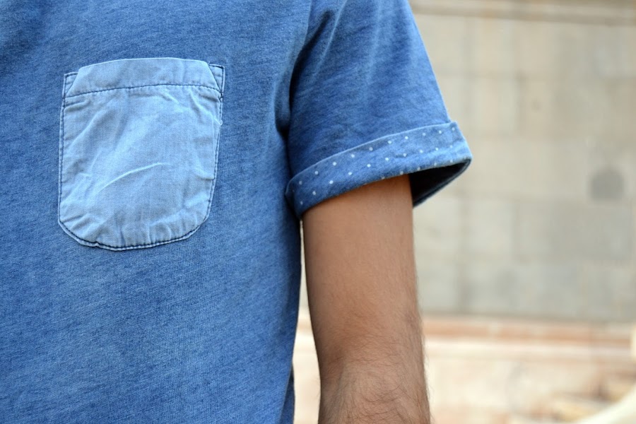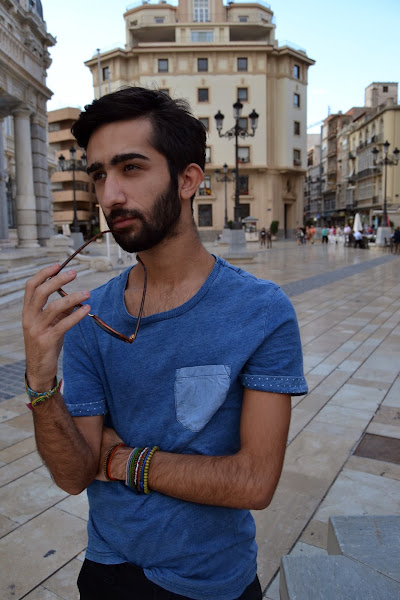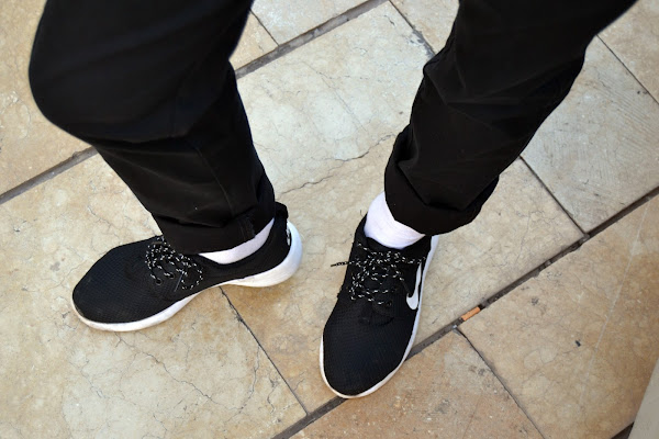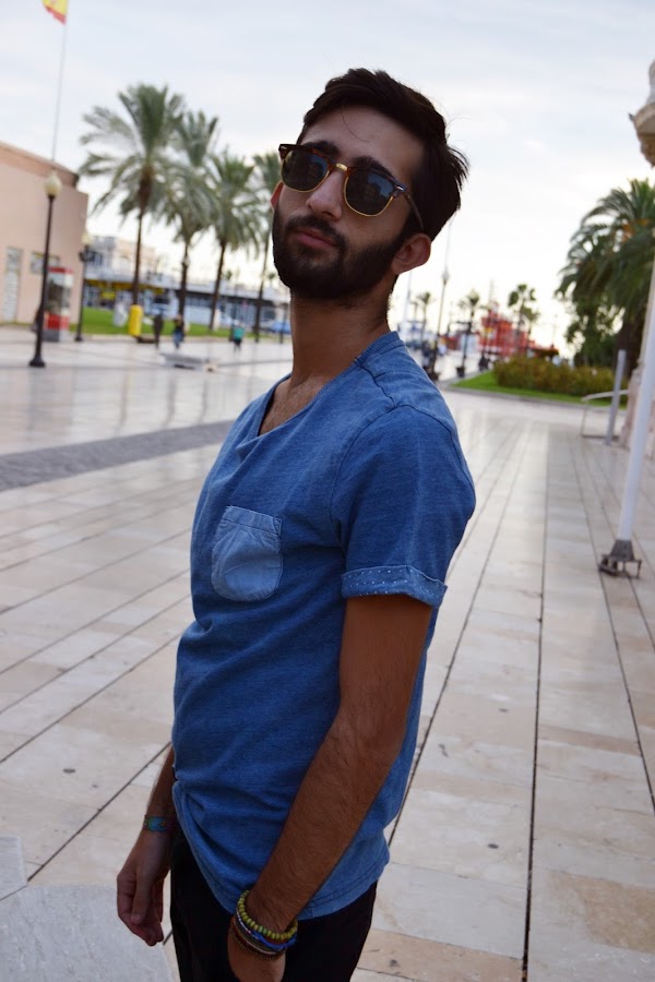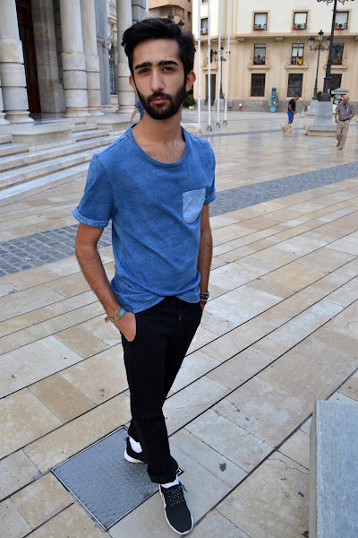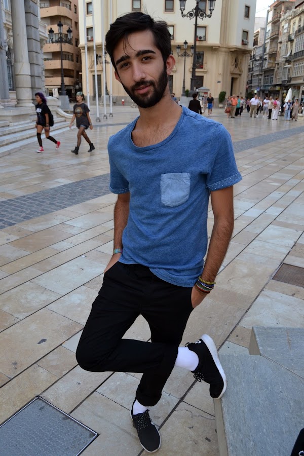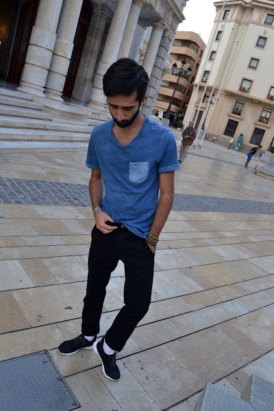 Era un look bastante clásico, pues solamente llevaba una camiseta de algodón azul desgastado, mi pantalón negro a juego con mis Nike y añadiéndole un toque de claridad le puse el detalle de los calcetines blancos. También añadí mis gafas de sol preferidas, estoy enamorado.