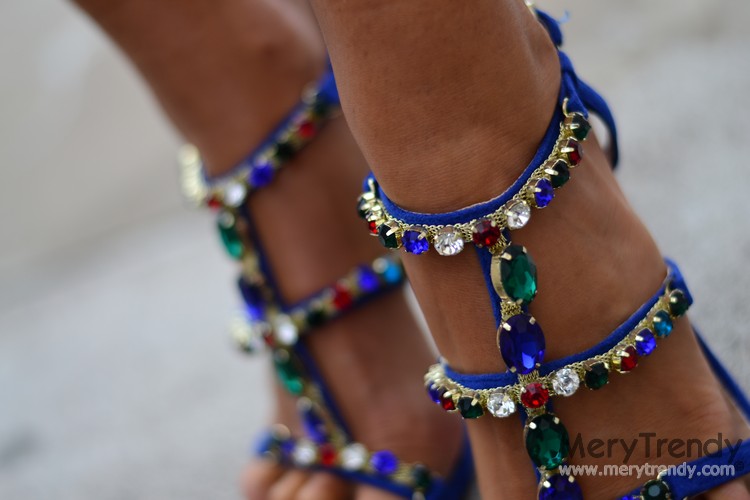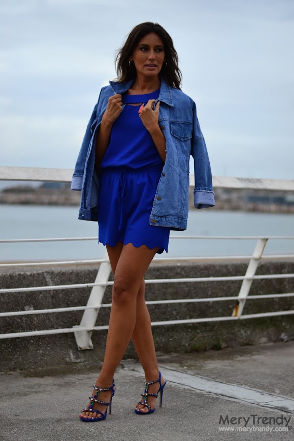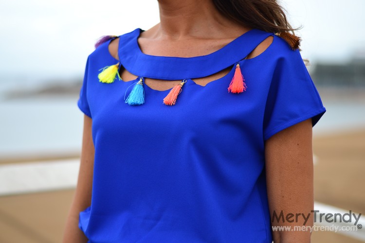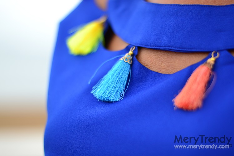 Este mono en concreto, me encanta, porque además de ser en un color tan favorecedor como el azul klein (de mis favoritos), trae una especia de borlas en diferentes colores que le dan un puntito así como divertido. En cuanto lo vi en la web de Romwe, rápidamente me acordé de mis Exé azules con pedrería que tanto furor causaron en el verano pasado y que le van que ni pintadas (creo yo) porque los colores de las piedras coinciden con las de la prenda en cuestión.