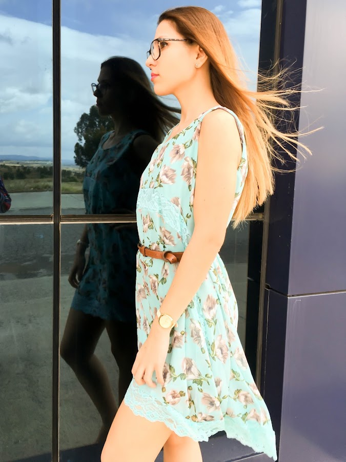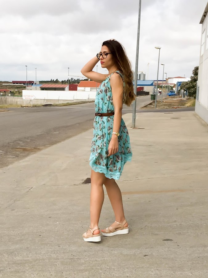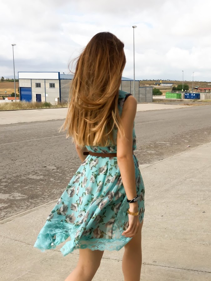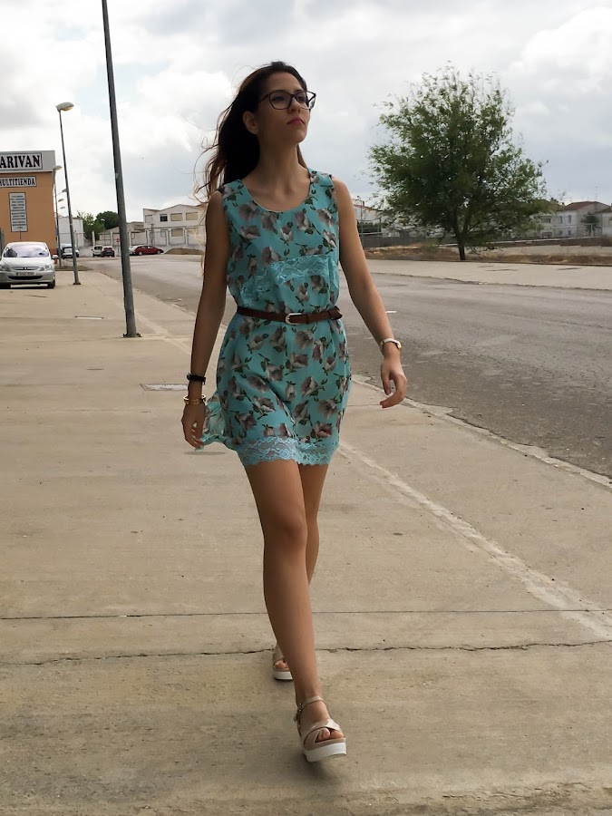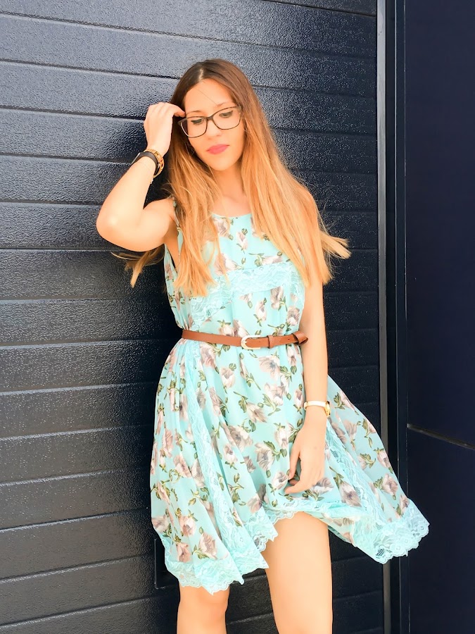 Me encanta el color del vestido que os enseño hoy! Es como el color del mar de aquellas playas paradisíacas, tan lejanas y que tanto deseamos visitar. Unas veces lo veo azul y otras veces lo veo verde... Vamos a dejarlo en un tono azul verdoso, jaja! De corte asimétrico, ya que es más largo de los laterales, con un estampado floral y un detalle de encaje que va desde el pecho hacia abajo en los laterales y en el bajo. Eso sí, cuidado los días de viento, porque yo tuve que luchar con él para no enseñar mis encantos a lo Marilyn Monroe, jaja!