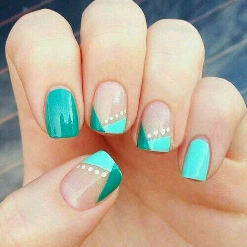 Esmaltar la uña del dedo meñique de color celeste y la uña del dedo índice de color azul así como dar una doble capa a las uñas de los dedos anular y corazón.
