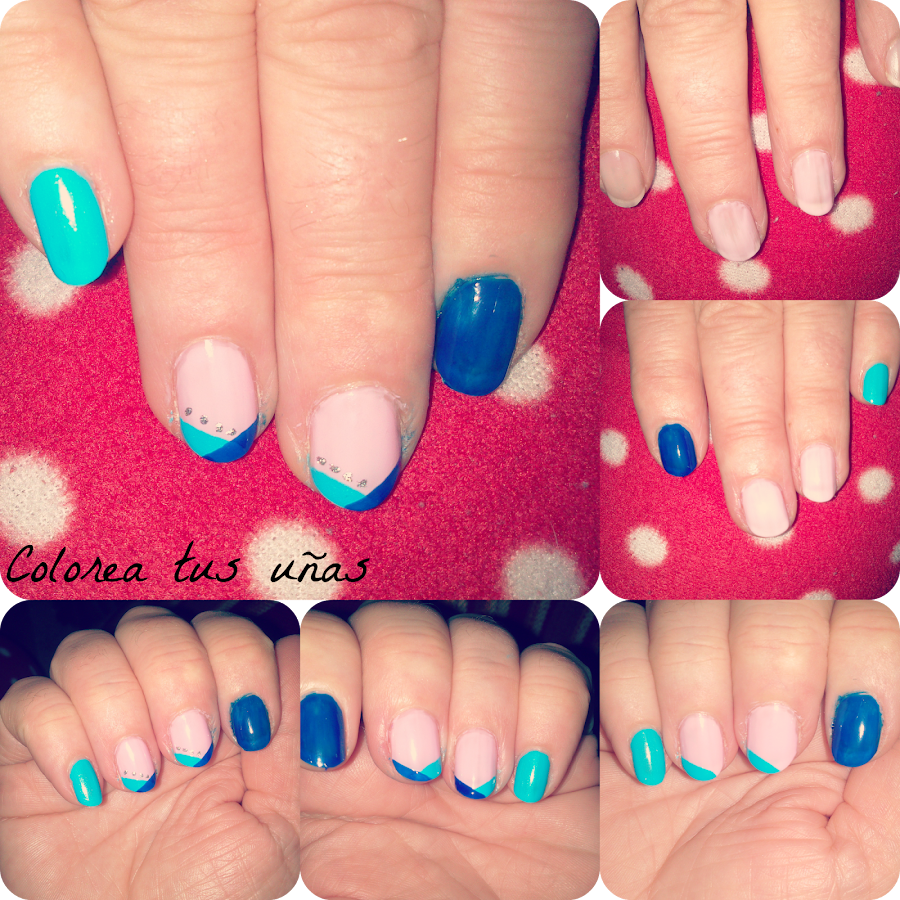 Esmaltar de forma inclinada, sobre las uñas de los dedos anular y corazón, el borde libre de la uña de color celeste. Para este paso se puede usar tesafilm, para asegurarnos de que las líneas salen rectas. En mi caso, lo hice directamente.