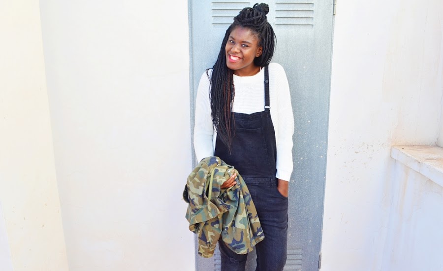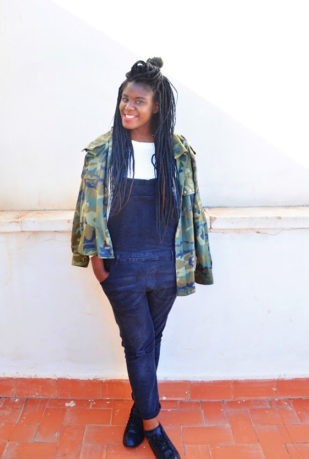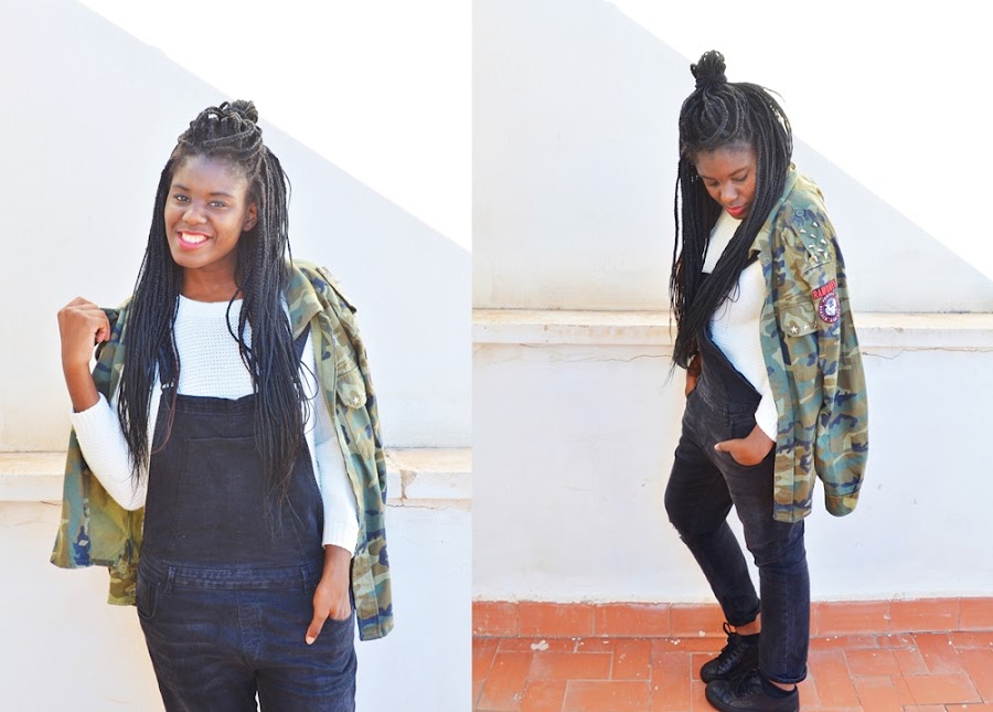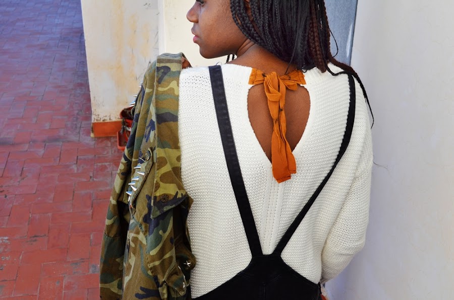 Y bueno el outfit que os enseño hoy ya habéis visto todas las prendas alguna vez, soy algo pesada cuando veo prendas y digo que son básicos para mí ,pero es que un peto y tener esta chaqueta militar también lo son. Este jersey , es super gordito y oversize... me encanta el lazito que lleva detrás (era negro pero ya se sabe eso de juntar blanco con otras prendas jajaja así quedó).Si os contaba en el anterior post que el frío había entrado de lleno en Murcia, os puedo decir que hoy las temperaturas han subido notablemente y los abrigos se pueden dejar en casa, un poco de locos sí.