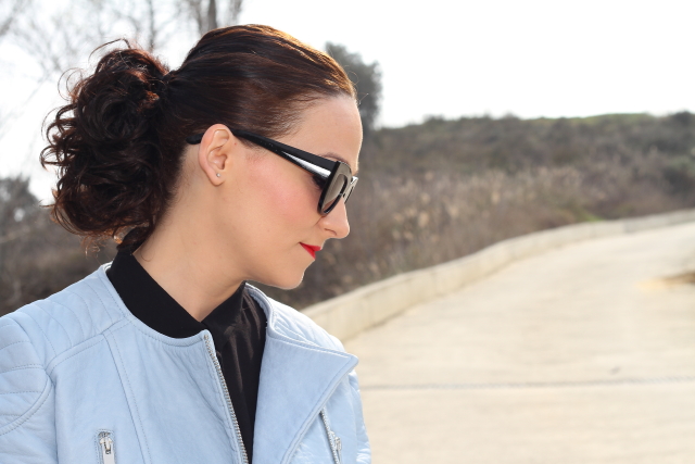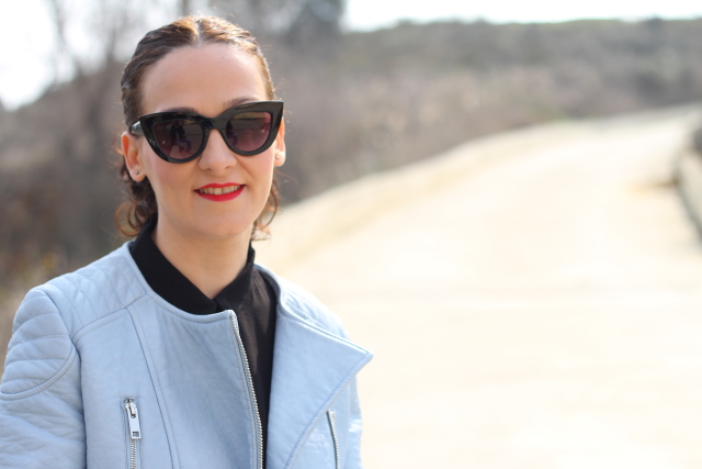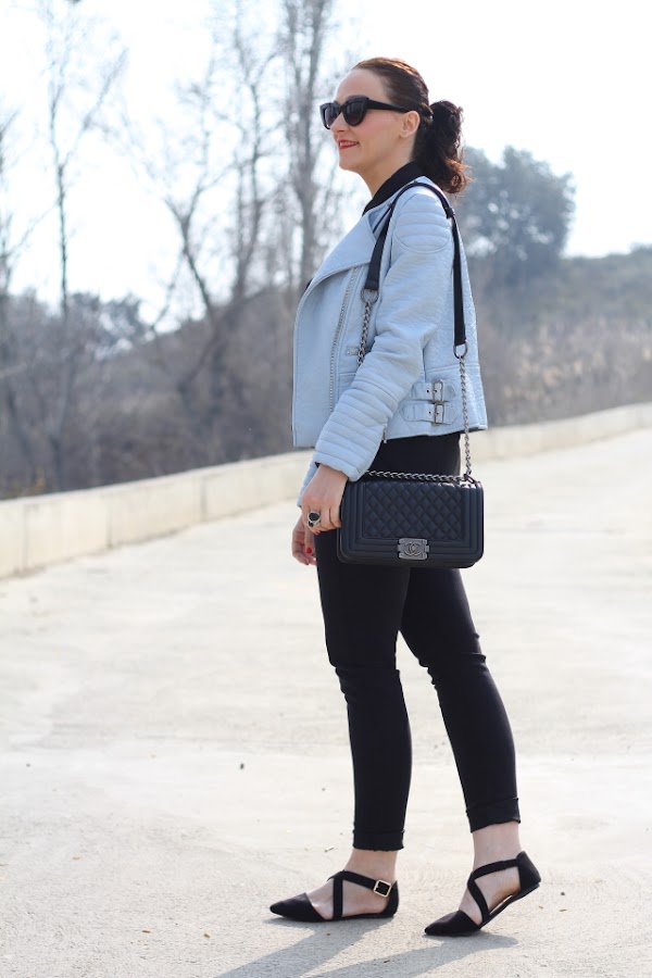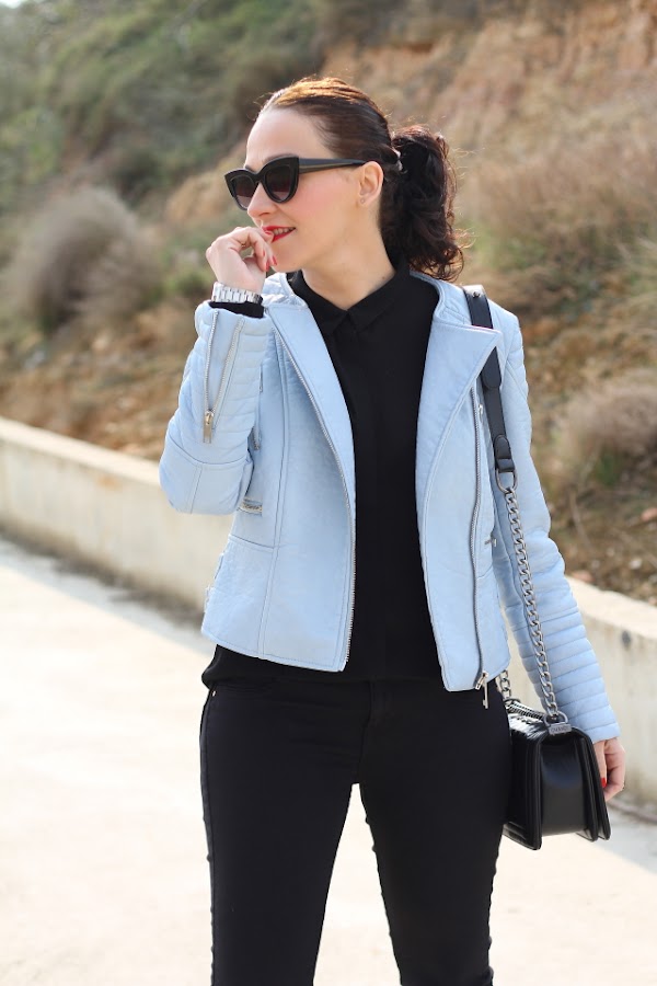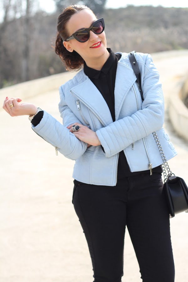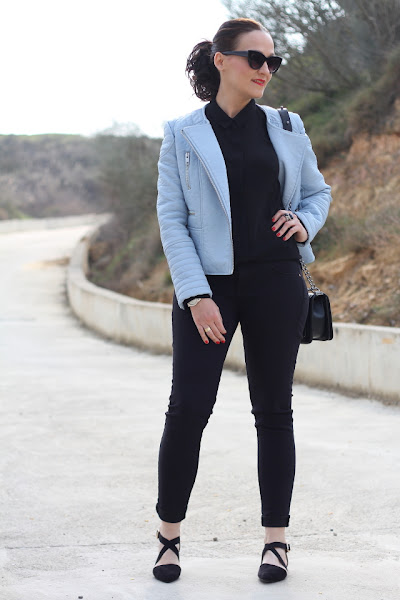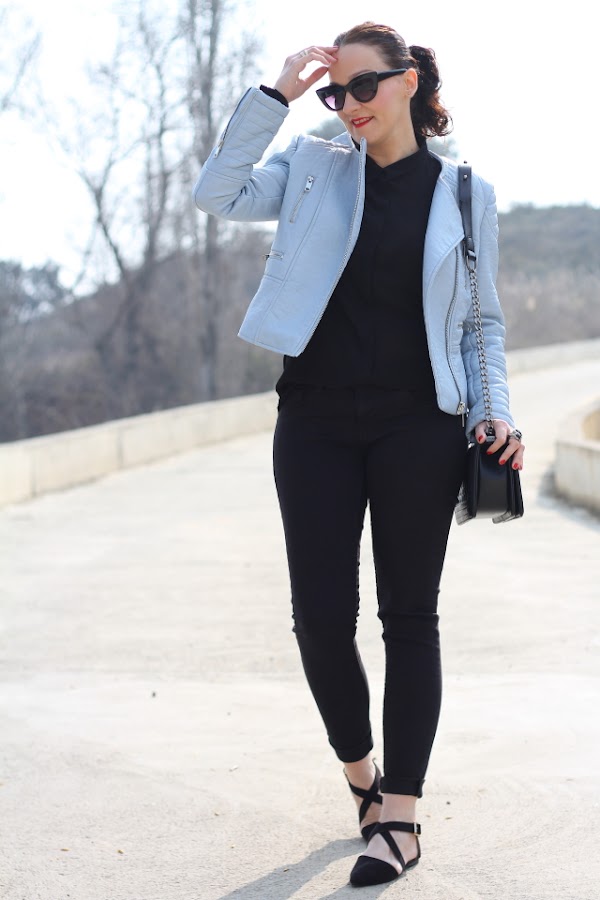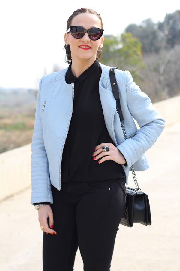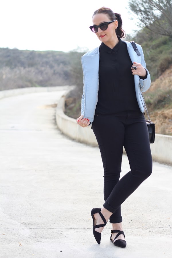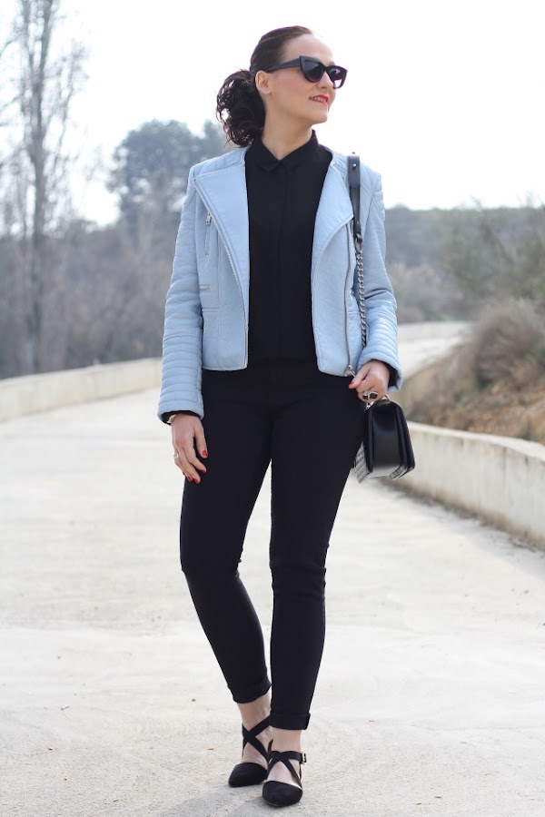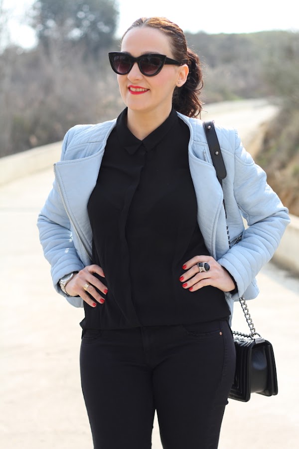 Parece que la primavera no se atreve a instalarse del todo y aun tenemos algunos días que refresca un poquito más. El outfit de hoy es ideal para estos días, un total look negro con camisa y pantalones pitillo al que le he combinado una biker azul bebe.