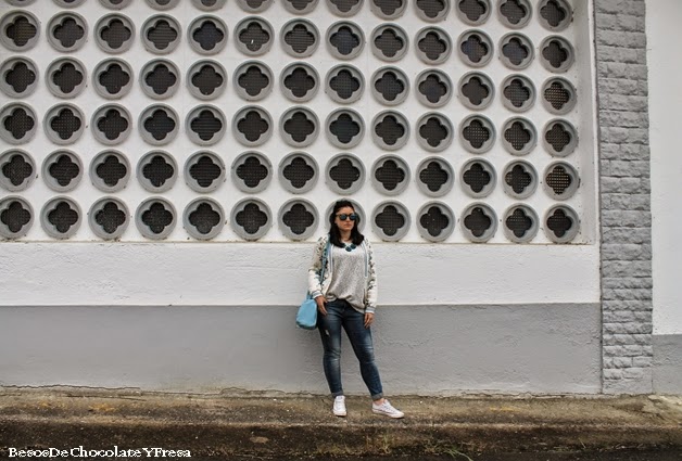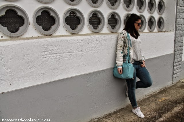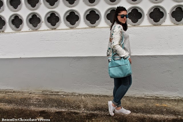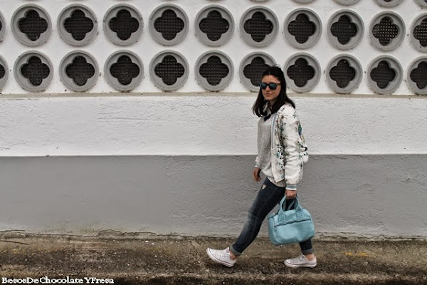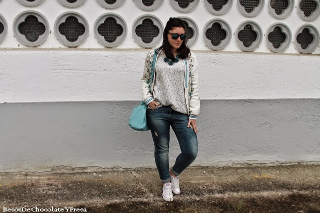 Llevo, jeans con sweater jaspeado, converse, bomber con motivos de animales y florales en el mismo tono que el bolso y collar en marino para darle algo de contraste al look.