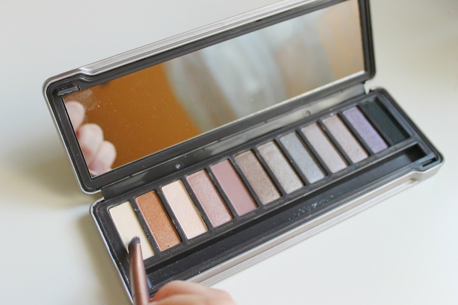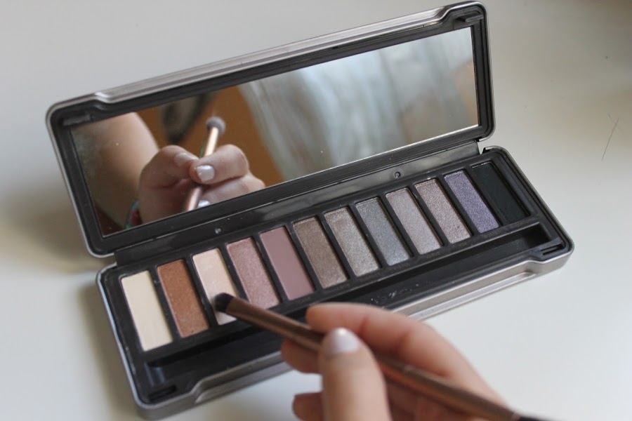 Now we start with the eyes. I use light colours because I like go natural to high school. I use the first eyeshadow Foxy (from my Naked eyeshadow palette) like base.