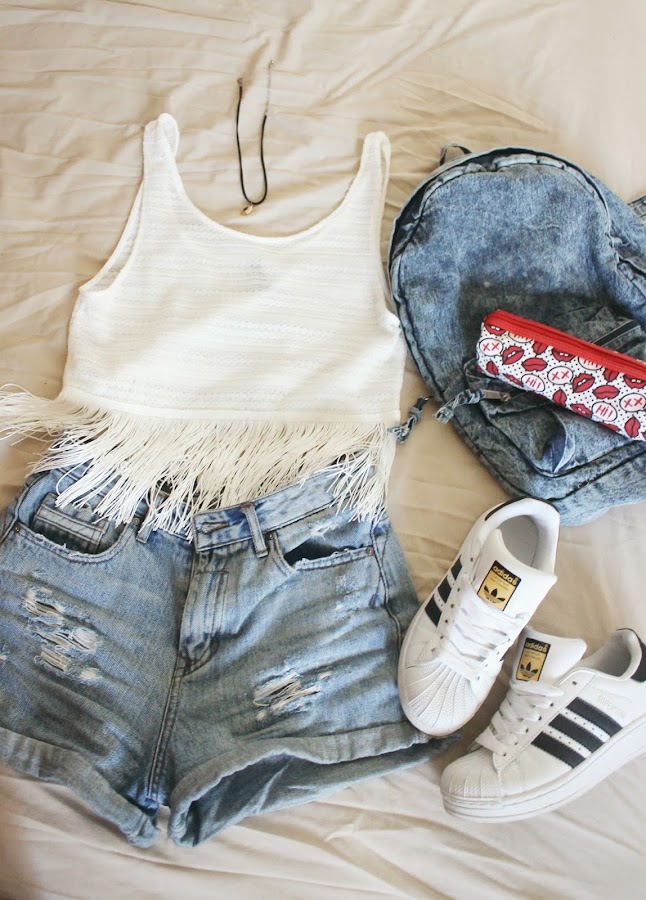 Por último, un look súper sencillo, bonito y fresco para el primer día de clase. Unos shorts vaqueros de pull&bear, camiseta blanca de flecos de h&m (old), mi nueva mochila de primark, estuche de h&m y adidas superstar.