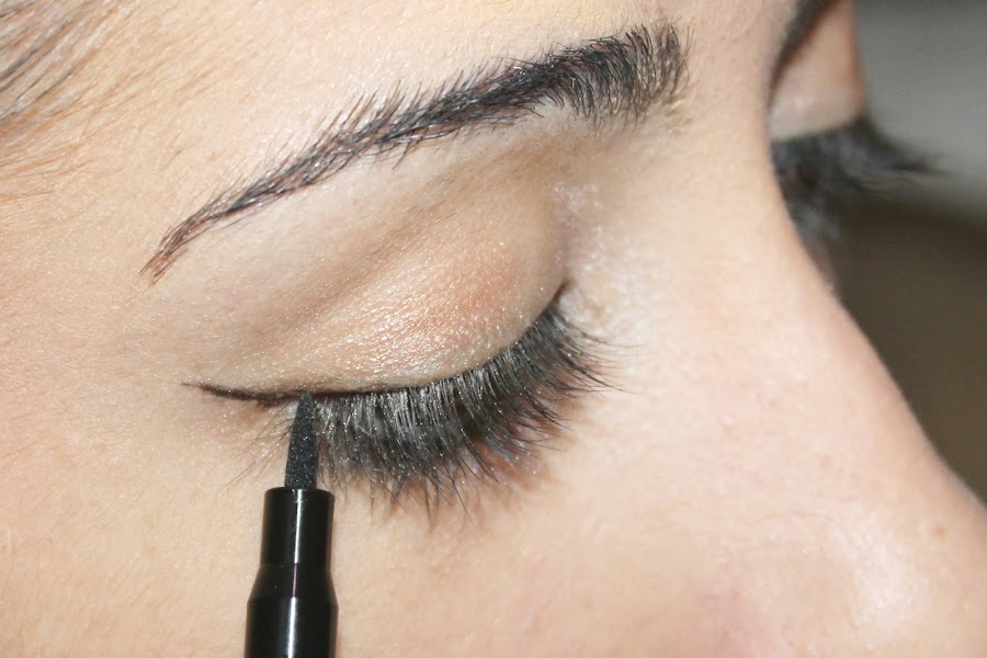 Ahora vamos con la raya del ojo. Soy muy mala en este paso así que el otro día me compré este eyeliner rotulador de la marca essence (cómo no!) y la verdad que me resulta mucho más fácil. En vez de seguir la raya de arriba, sigue la de abajo.