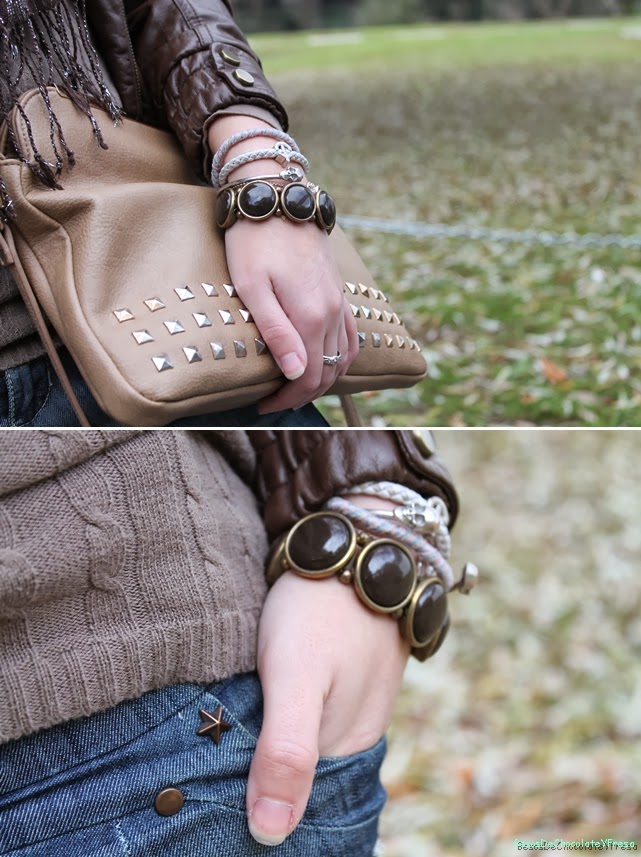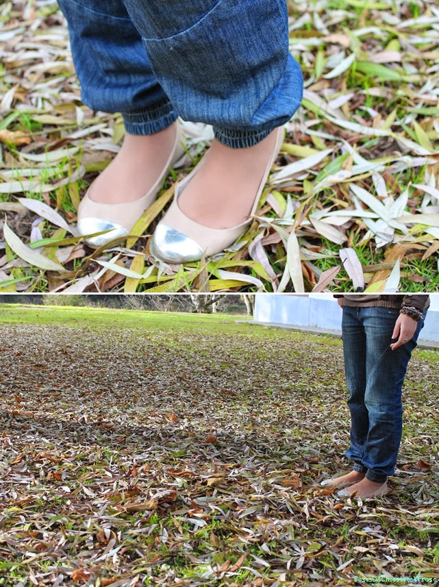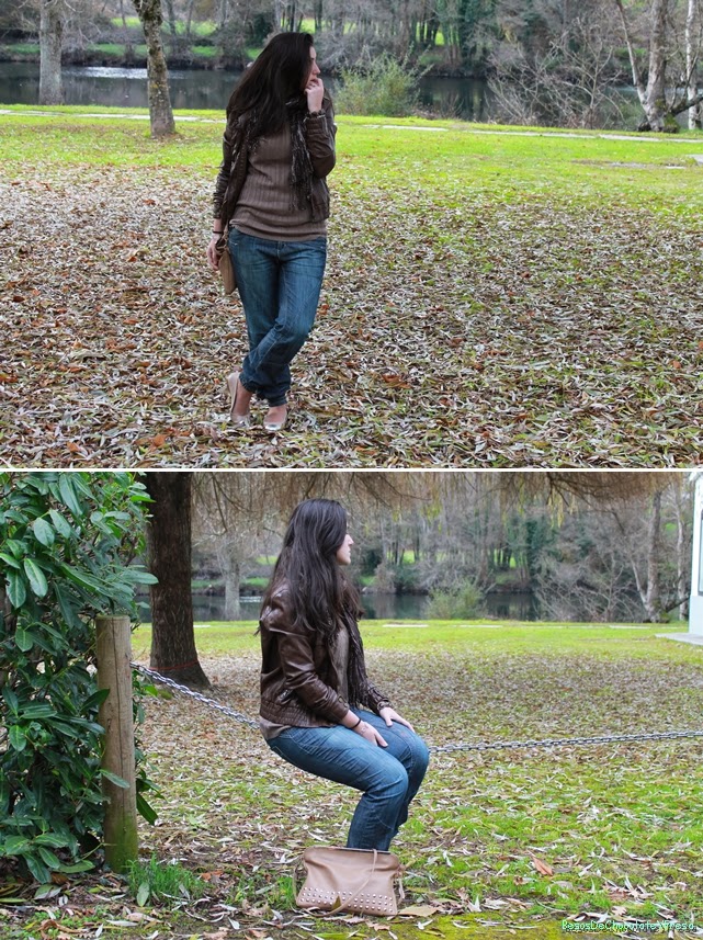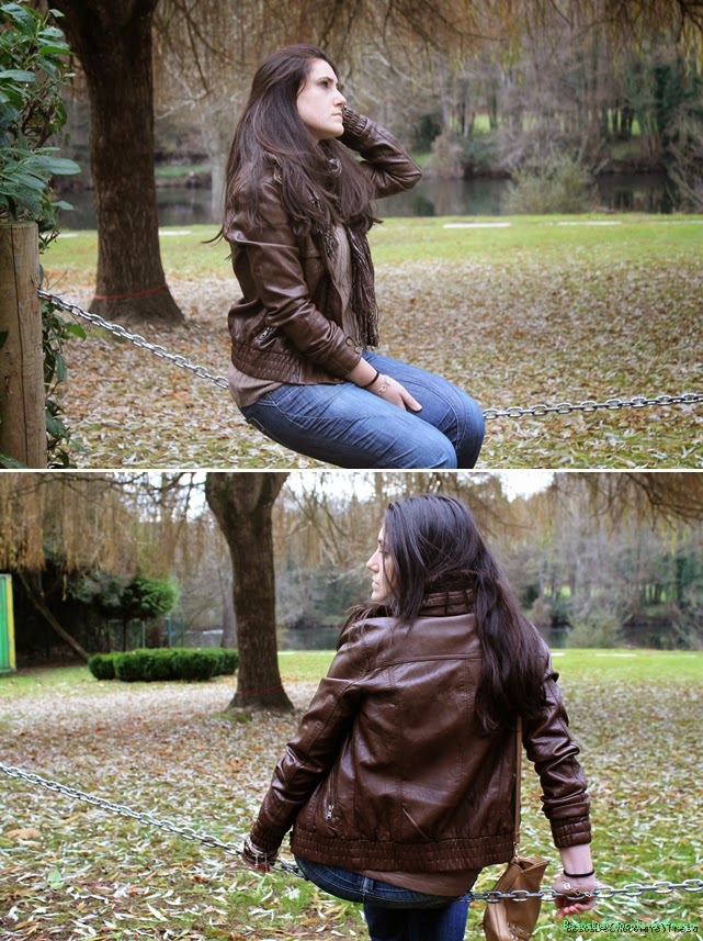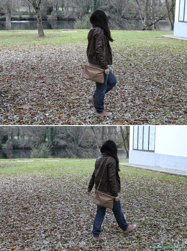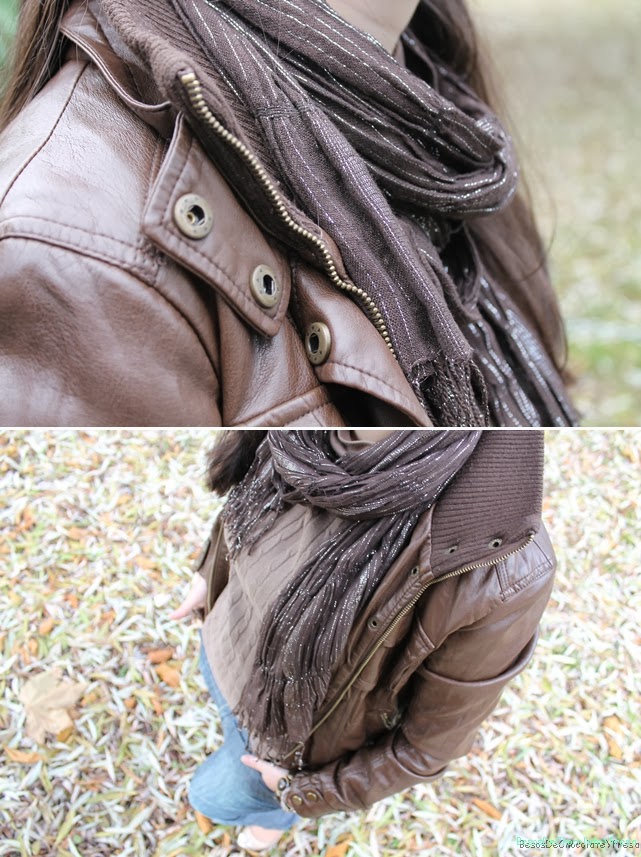Para esta ocasión llevé para dar un paseo con mi chico, unos jeans tipo baggy con puños en los tobillos y que me resultan muy cómodos. Los combiné con sweater de ochos en marrón y chaqueta de cuero en marrón más oscuro. Como complementos bailarinas y bolso tachuelas en color nude y foulard en marrón con brillos.