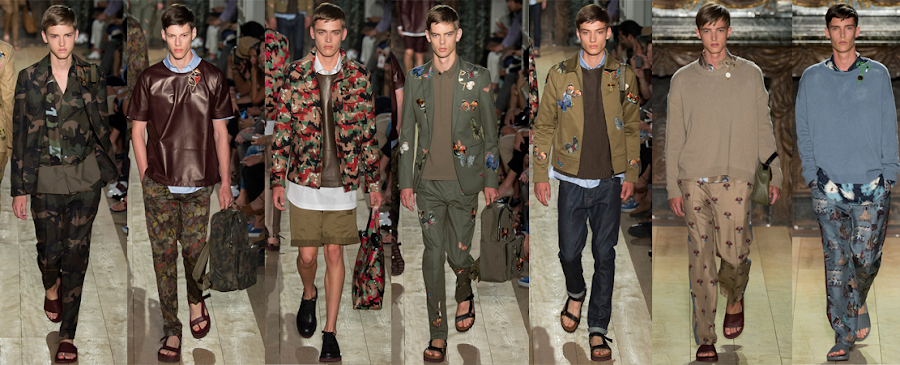 Valentino se abandera como el rey del camuflaje, el cual se ha hecho muy presente en sus colecciones anteriores y para el próximo verano sigue teniendo su protagonismo, cazadoras y trajes se llenan de mariposas, las sedas estampadas son otro de los recursos utilizados en la colección.