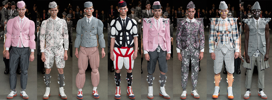 Alguna de las propuestas van un poco mas allá de lo arriesgado y lo provocativo como es la colección que ha presentado Thom Browne, con sus arlequines enmascarados o Commes des Garcons que se inspira en las botas tribaleras del pueblo mejicano Matehuala para sus propuestas, yo espero que estas tendencias se queden en la pasarela y no pasen mas allá.