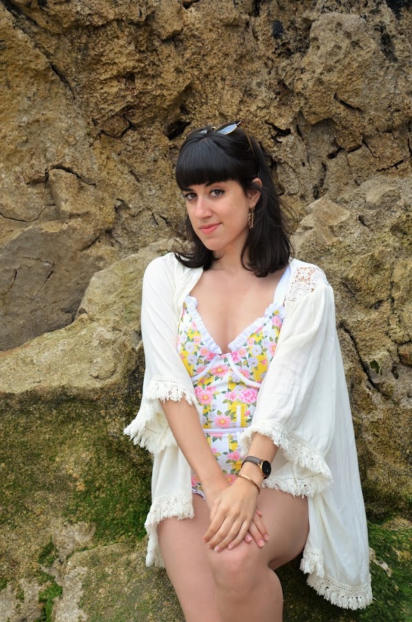 Os comenté que fueron dos las prendas de mi pedido y la última de ellas es este bañador de estilo pin-up con estampado de flores rosas y rayas amarillas y blancas.