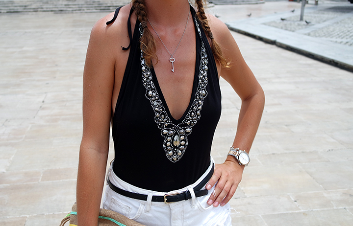 Este bañador con la espalda al descubierto, escote y pedrería la verdad que me tiene loca y con unos shorts blancos de talle alto creo que queda de maravilla, que os parece?