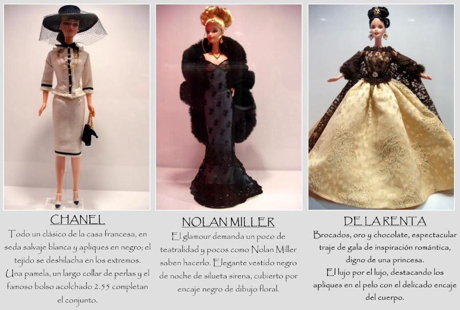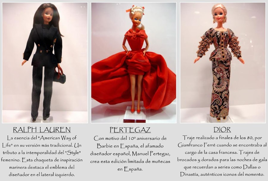En el mundo actual, Barbie dejó de ser una muñeca para convertirse en un icono de la moda, por ello, numerosos diseñadores y grandes marcas la han vestido con su mejores galas. Ha aparecido en películas, en series como Los Simpsons, se ha casado, se ha divorciado, ha tenido hijos, ha asistido a grandes eventos, le han dedicado canciones, libros y ha tenido duras competidoras, sin éxito. Hace poco tuve la oportunidad de ver una exposición del tema y me pareció interesante enseñároslo, al menos, una pequeña muestra.