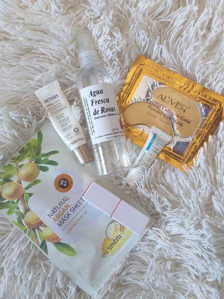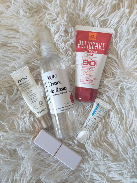 En este caso aplico mi Tónico o Agua de Rosas y luego mi crema facial y contorno de ojos. No puedo olvidar jamas mi Protector solar, y esto como se los digo miles de veces, lo utilizo invierno, verano, primavera y otoño.