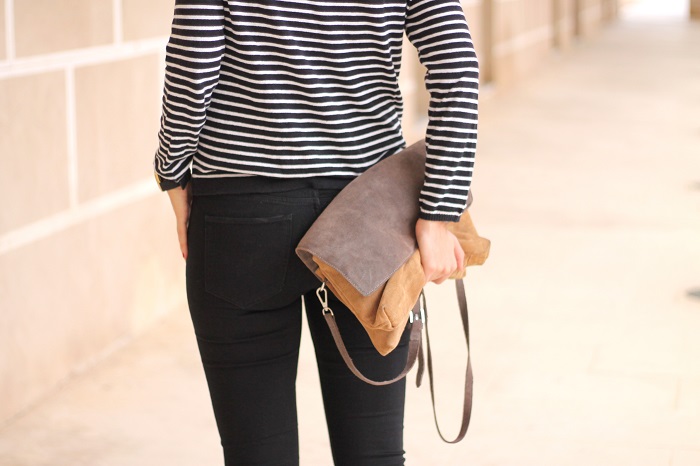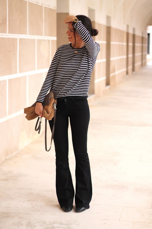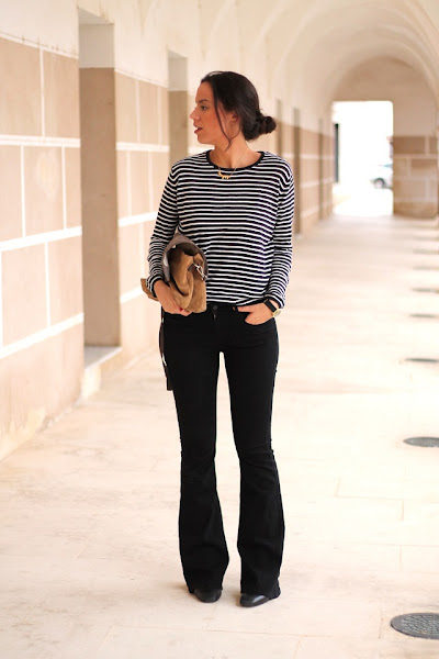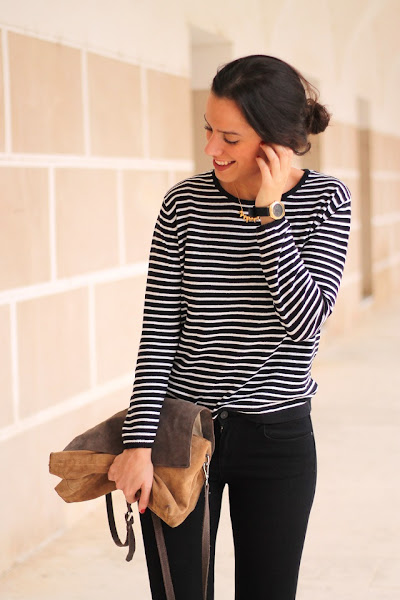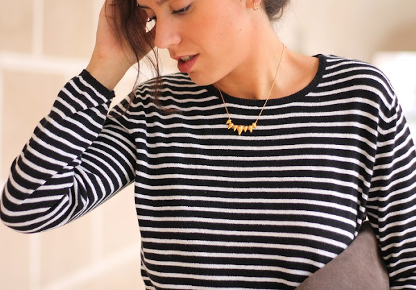 Aquí muy en mi línea, básica, en color negro y rayas marineras. Un fino jersey de punto, botines de tacón bajo, y un collar minimalista precioso de la firma de joyería Market Place New York. Look que escogí para un viernes ir a trabajar y saber que después no regresas a casa hasta tarde.