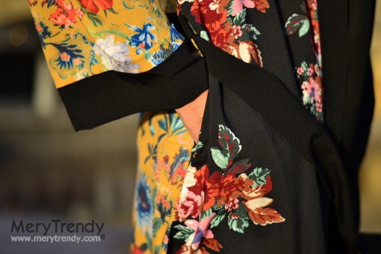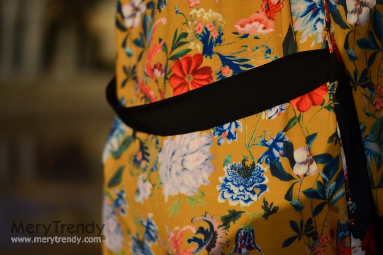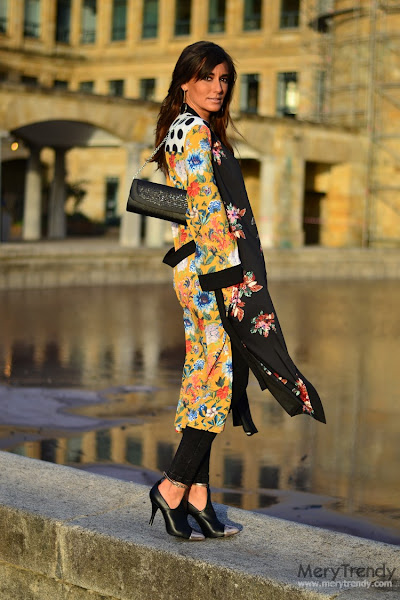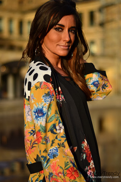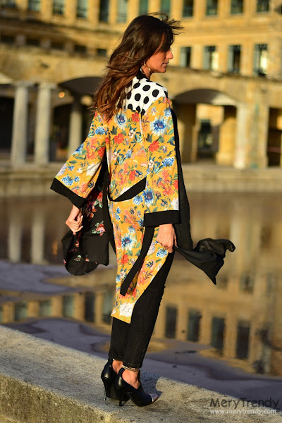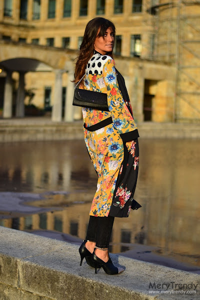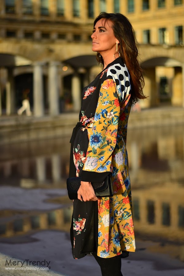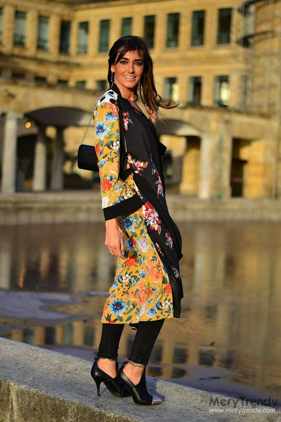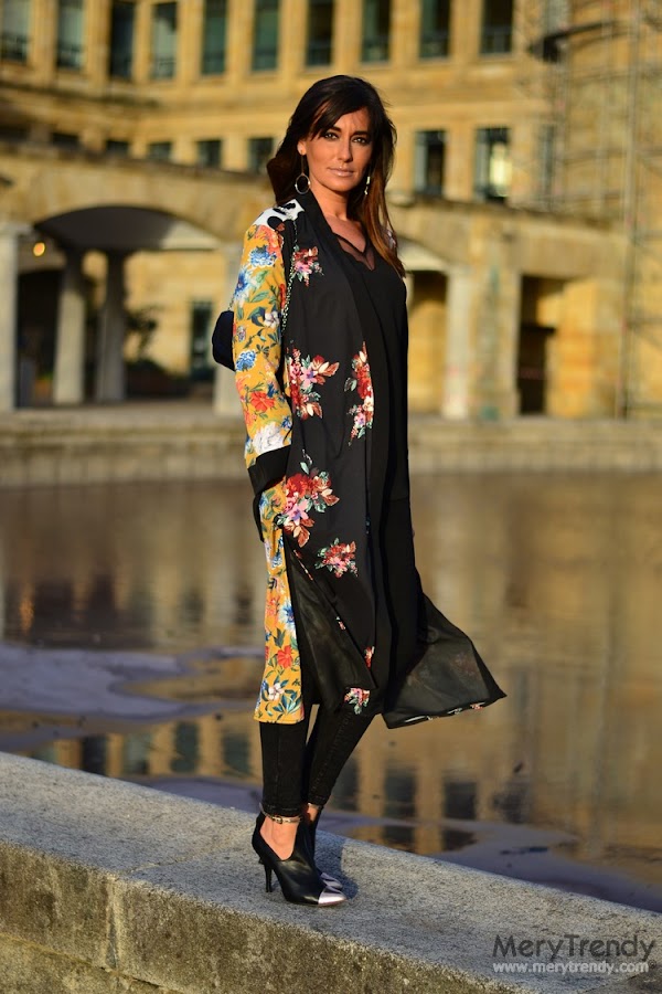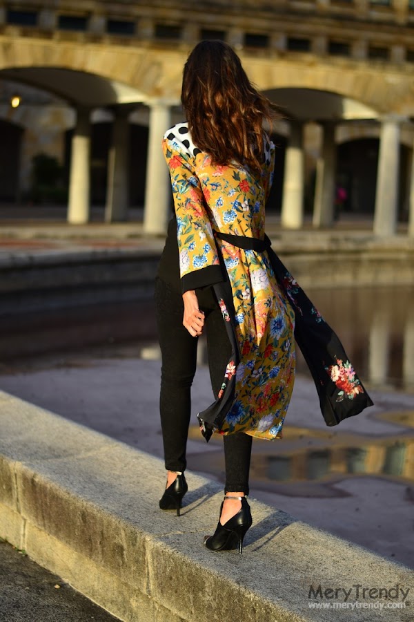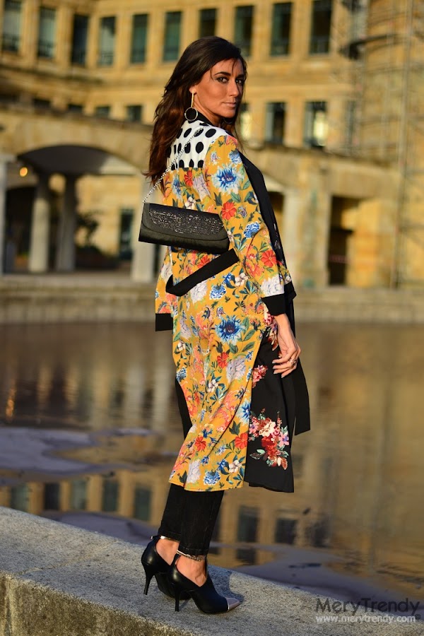 En cada look que os propongo, siempre hay una pieza estrella en torno a la cual construyo el mismo y, en esta ocasión, como ya os estaréis imaginando, se trata de esta preciosa bata tipo kimono, larga, que se contagia del espíritu del Lejano Oriente. El caso es que me pareció ideal para conjuntar con mis prendas lisas de fondo de armario del tipo vestidos lenceros o, como en el caso de hoy, con unos skinny jeans en negro y un sencillo top con escote en pico dado el estampado tan alegre que presenta.
