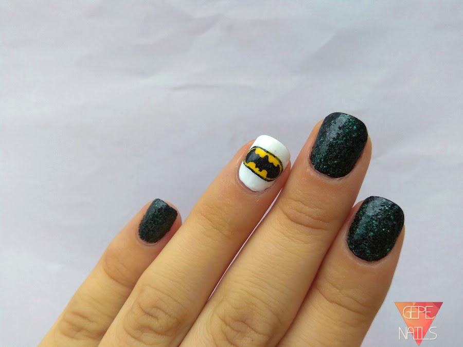 La manicura como veis es muy sencillita. Se compone de una manicura negra con purpurina y un accent nail de batman.