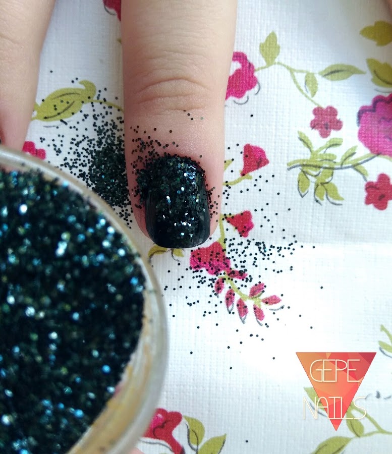 Para poner la purpurina, hice la técnica de pintar la base y dejar secar, y a continuación, volver a pintar una capa de esmalte, en este caso negro, y volcar encima la purpurina, como si fuera una lluvia de glitter (¿Os imagináis una lluvia real de glitter? Ayyy :D ) y antes de quitar el sobrante, presionar ligeramente para que se queden pegados todos los copitos.