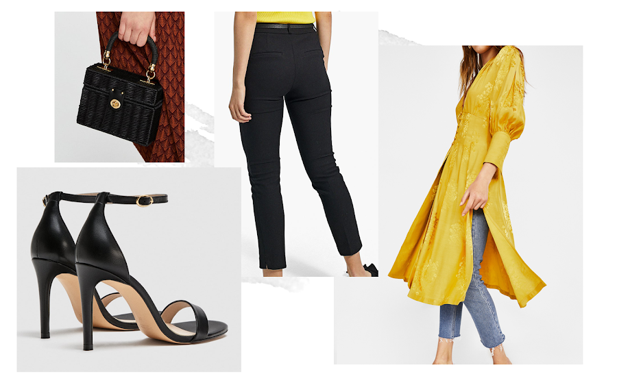 Yo creo que el amarillo es uno de los colores clave de la temporada, así que no podía faltar en mis propuestas para eventos esta temporada. Este kimono brocado de Bershka llamó mi atención al instante y me parece una buena opción para un look diferente. Tanto con pantalón de traje para una ocasión más formal, tanto como con vaqueros para algo más desenfadado, lo veo perfecto. Con accesorios básicos en negro, aunque con el toque chic del bolso, y unos pendientes de aro grande en dorado ya tendríamos modelito, y además con prendas fácilmente reutilizables para cualquier otro momento. Este look lo veo con un moño alto desenfadado, estilo "messy bun".