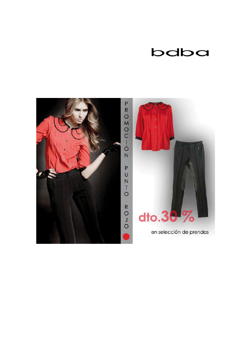 El título tiene su por qué, no os rayéis: en BDBA conocida tienda de moda que todos los años nos sorprende con sus colecciones de fiesta y calle, nos trae en promoción para sus prendas de la colección Main Fall Winter 2010 el "PUNTO ROJO", serán prendas marcadas que tendrán un descuento especial entra el 20-30 % de DESCUENTO. Todo esto disponible a partir del 5 de Noviembre en tienda online y los establecimientos de: