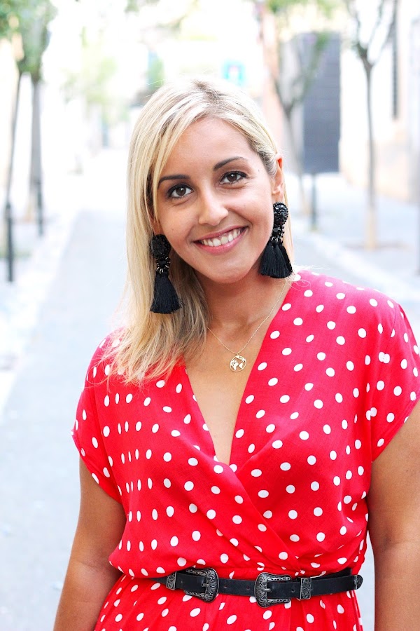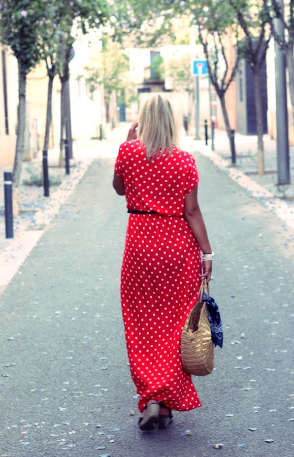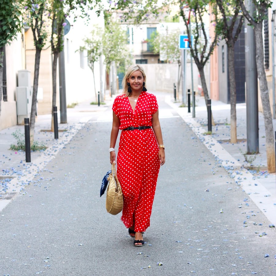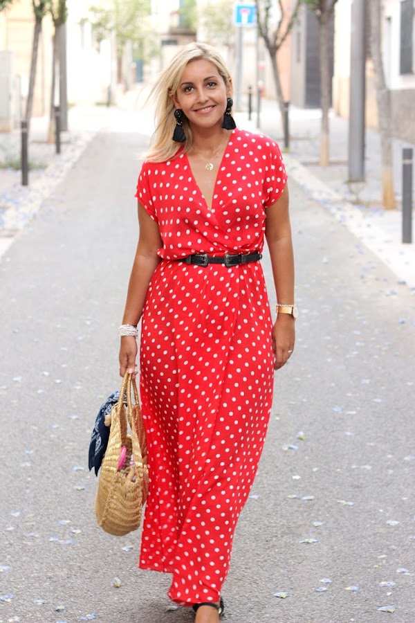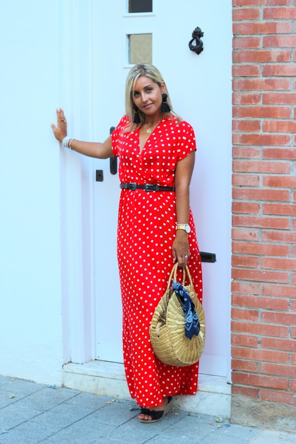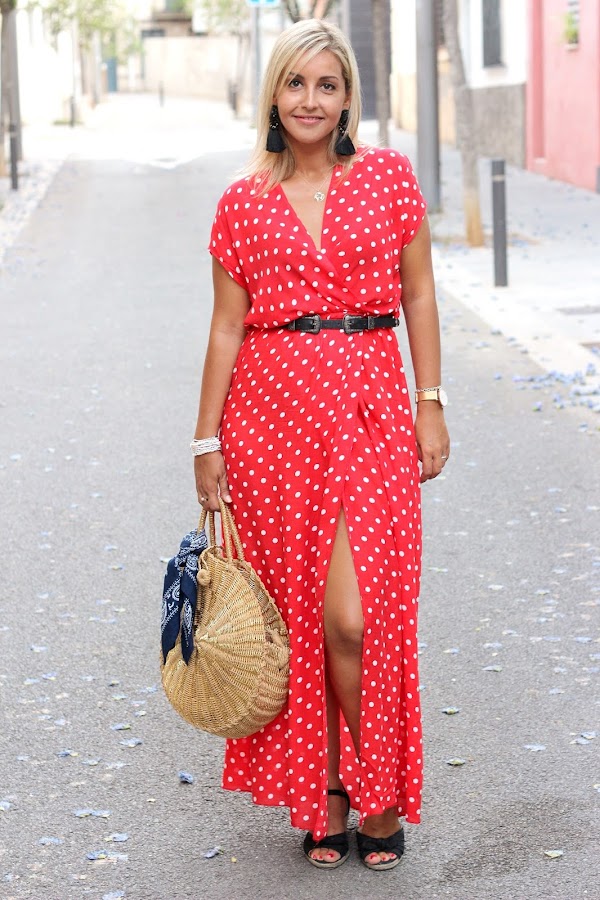En el look de hoy os enseño mi nuevo vestido de topos que es totalmente al resto de vestidos que tengo con este estampado, no sólo por su corte, sino por el color, porque creo que es el primer vestido que tengo rojo en el armario y la verdad que creo que no a ser el último. Una de las cosas que me gustó de este vestido es que fuera largo, ya que creo que este tipo de vestidos son perfectos para el verano y estilizan muchísimo. Asimismo, el escote cruzado que tiene, creo que favorece muchísimo.