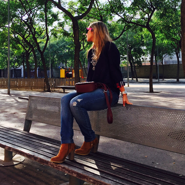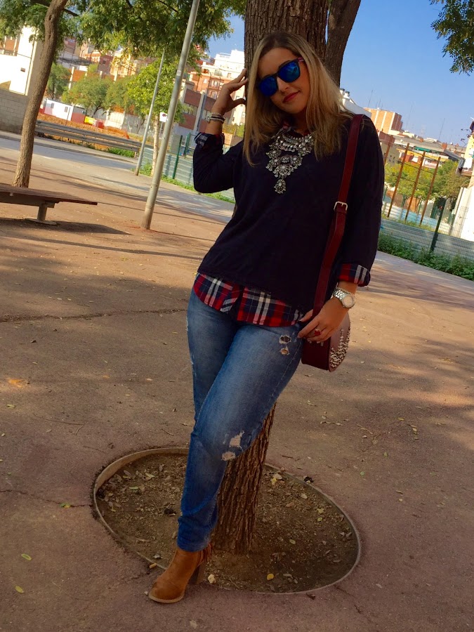 Today I show you a comfy outfit that I love it for its simplicity. This kind of outfits are timeless and they are a wildcard in our outfits when you dont know what to wear. In the outfit of the day, I wore the garment of the month, plaid shirt, with jeans and I put a blue sweater over the shirt. To give a chic touch to the outfit, I put my boho necklace, my new burgundy bag of Parfois and my new boots with fringes of Shifstore that they are very comfortable.