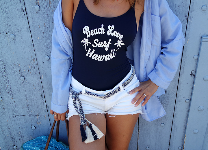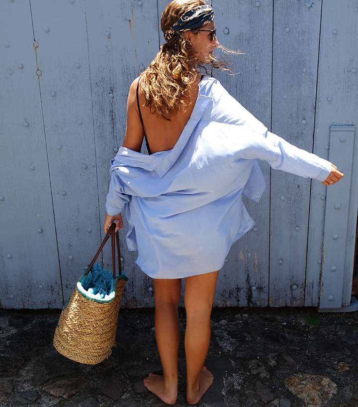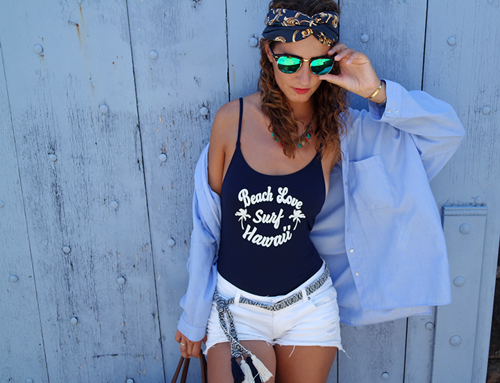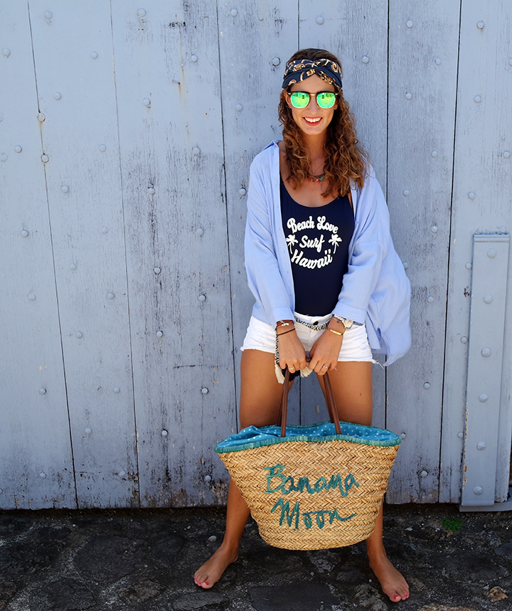 Today I bring you a look that I especially like in a gamma of blues. It is composed of a one piece swimsuit, my favorite oversize shirt and white shorts to break with the monochrome of blues. The key accessory is my beach bag from Banana Moon, that has become my favorite bag since I arrived here, I wear ir every single day, it has the perfect size to put all my things to go to the bach, and I can tell you they are a lot, I guess you know what Im talking about :)
