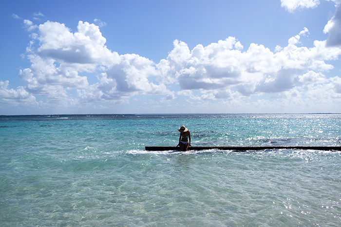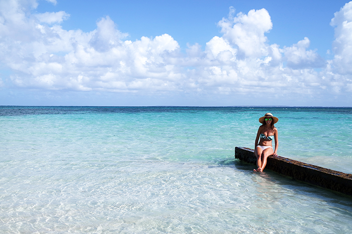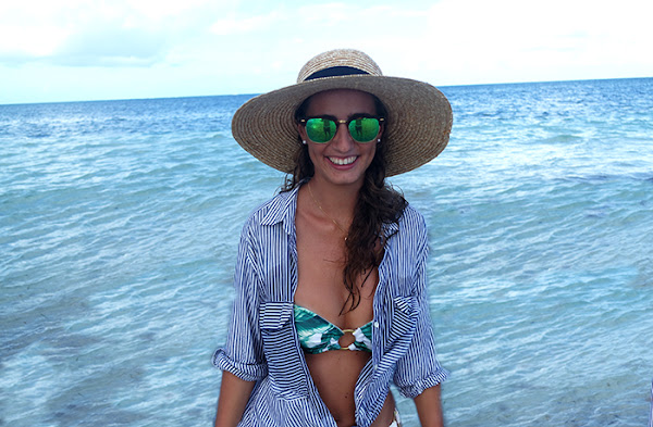 Para pasar el día en la isla me equipé con mi sombrero de ala ancha, camisa oversize a rayas azules y blancas y un bikini bien alegre.