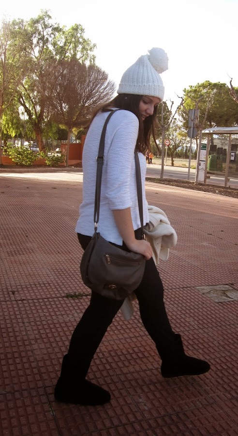 Sinceramente, no soy de las que apuestan por el color blanco en invierno. Pero la verdad es que me encanta este color,sobretodo en verano puesto que es perfecto para potenciar el moreno de la piel. Creo que pronto haré un total white, lo he estado probando frente al espejo y el resultado me chifla!! El gorrito es una nueva adquisición de Primark, y es que fue ver el pompón y comprármelo!! Las botas también son una nueva adquisición de Primark, y fueron un chollazo. La verdad es que al principio me echaron para atrás puesto que al ser tan baratas no me fiaba mucho de la calidad, pero de verdad que estoy encantada y ha sido una buena compra ya que son súper cómodas y calentitas. Este look es perfecto para ir a la uni o como en mi caso, ir de recados durante todo el día, yo siempre digo que tenemos que ir divinas de la muerte!! jajajaja