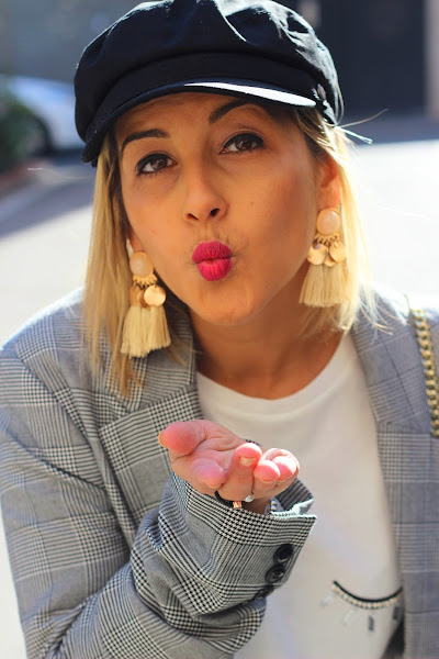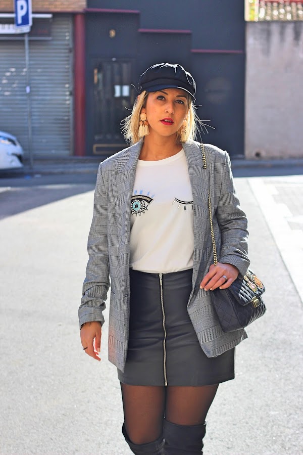 Today I show you an outfit with one of the garments of the season, the checked blazer. I wear it with a black leather skirt and a white tee with eyes with crystals. The accessories of the outfit were my black over the knee boots, a black bag with pins and my navy cap.