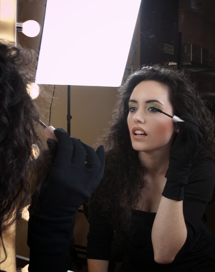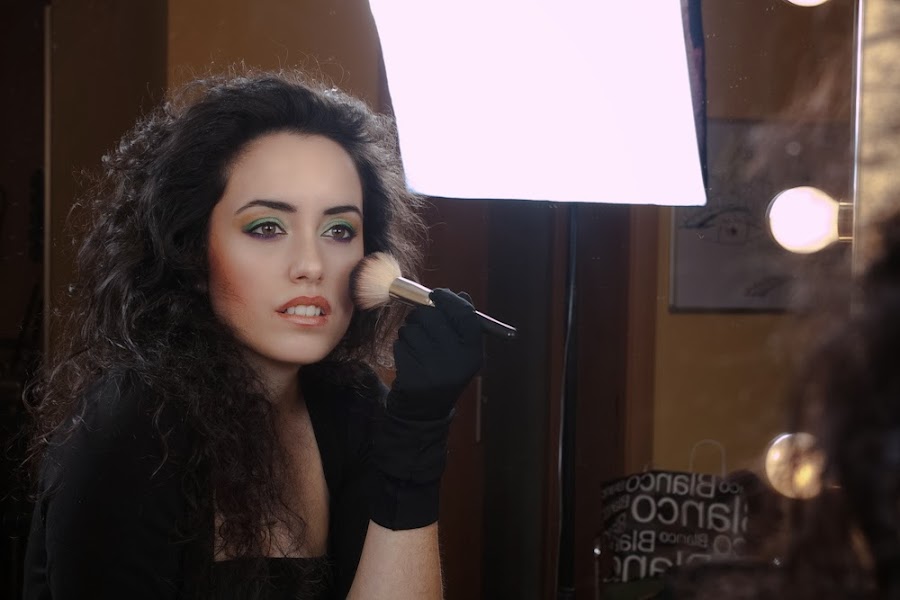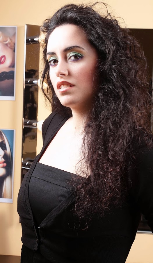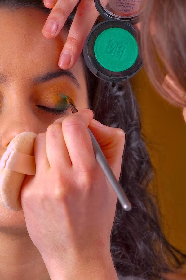 Raquel trabaja con productos de maquillaje de alta calidad, en esta ocasión, utilizó los pertenecientes a la marca BN Ben Nye. El maquillaje era exótico, inspirado en las mil y una noches y a mi la verdad es que me encanta probar cosas nuevas, así que me dejé llevar porque confiaba plenamente en ella. La sombra base aplicada en todo el párpado era anaranjada nacarada, la sombra del párpado móvil de un tono verde precioso, el eyeliner superior en negro y el trazo inferior a ras de pestañas en morado.