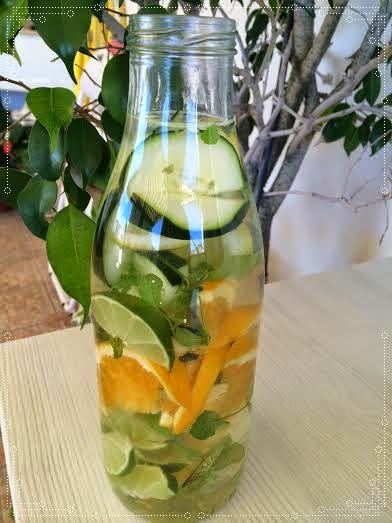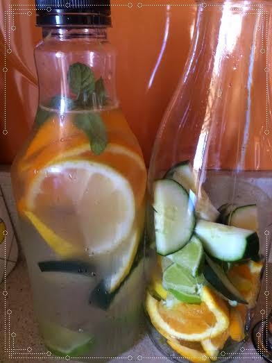 Rellenamos las botellas con todo, la mitad en cada botella, y ponemos el agua. Las dejamos en la nevera, o en un sito fresco y iremos bebiendo de un día para otro.