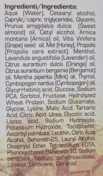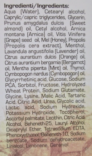 Tiene un olor dulcecito y muy agradable, que me recuerda un poco a vainilla..., sinceramente ¡¡me encanta!!. Supongo que es porque está enriquecida de miel, aceites de almendra, uva y árnica, timol y aceites esenciales.