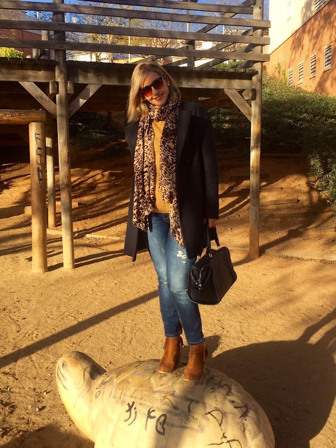 Empezamos nueva semana, casi recuperada de mi resfriado y espero estar al 100% dentro de nada. Hoy os enseño un look casual y comfy con mi nuevo jersey beige que compré en rebajas, que es super cómodo y a la vez muy abrigadito. Lo combiné con mis ripped jeans, abrigo capa en azul marino y mis botines de flecos, que ha sido mi mejor compra de este año. Los accesorios del look fueron un bolso en azul marino y el pañuelo con animal print, que le da el toque chic al look.