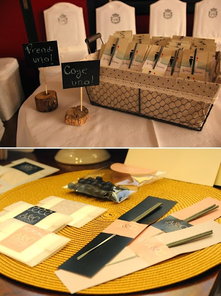 Se pueden entregar de manera individual utilizando cartulinas, etiquetas con la imagen de la boda, los nombres de los novios y la fecha o incluso alguna frase graciosa o bien entregarlas de forma conjunta agrupadas en botes o cestas decoradas.