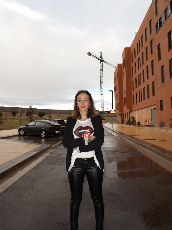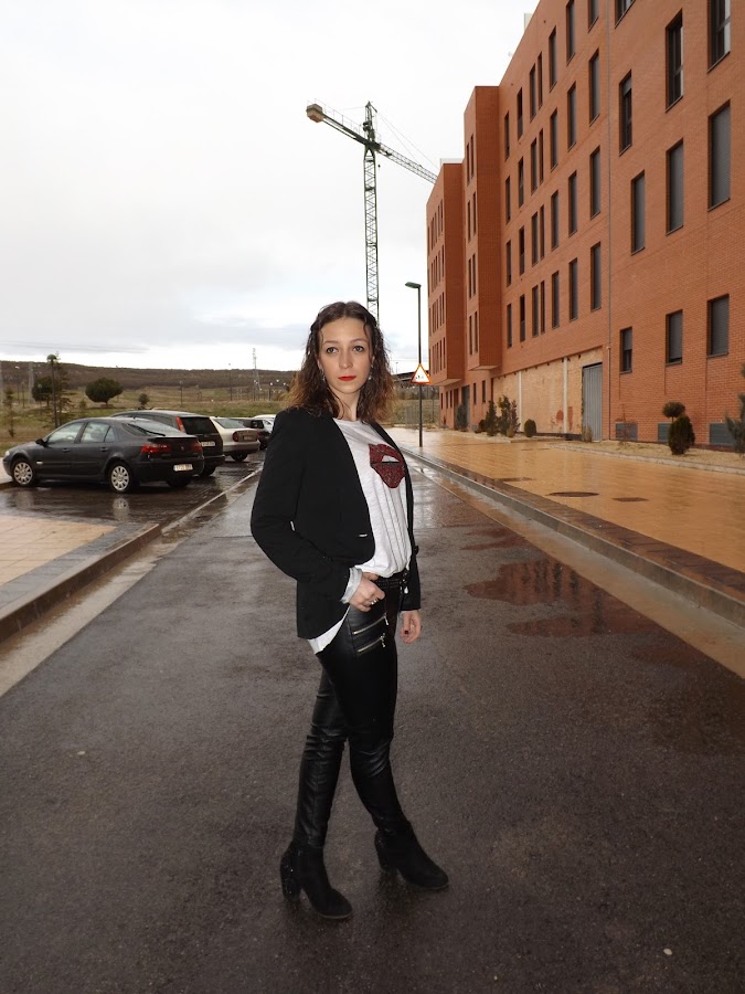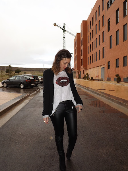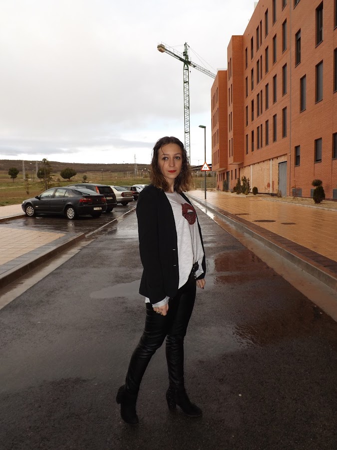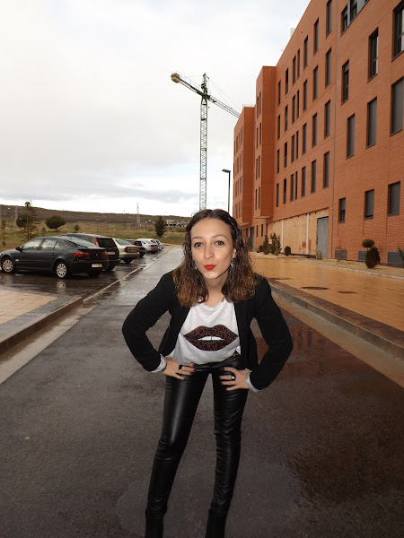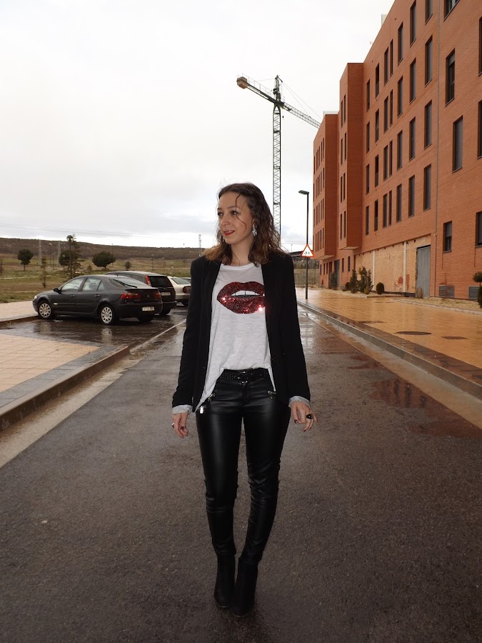 Tenía claro que quería ponerme otra vez esta camiseta que tanto me gusta pero con un estilo más formal que el que llevaba aquí. Puesto que después ibamos a salir de fiesta, decidí unirla a mis pantoles de cuero y a una blazer negra. Mi primera opción era ponerme un chaleco negro largo pero con las altísimas temperaturas de 1º que teníamos, enseguida se me fue la idea de la cabeza jeje.