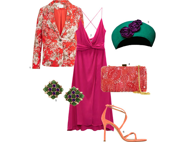 1. Blazer coral estampado, VILA (39.99€) 2. Vestido fruncido rosa, Zara (39.95€) 3. Boina de fieltro detalle floral, Hennin (89.00€) 4. Clutch pedrería, Elie Saab (790.00€) 5. Pendientes bicolores, Uterqüe (39.99€) 6. Sandalias coral, Pura López (245.00€)
