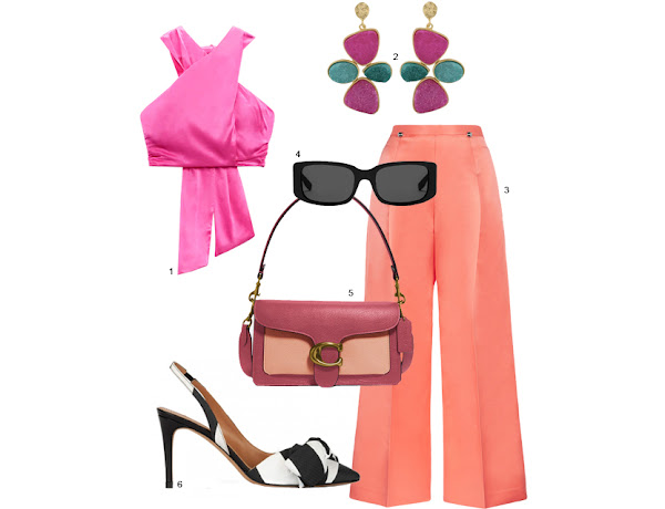 1. Top satinado rosa, Zara (22.95€) 2. Pendientes bicolores, Lavani (65.00€) 3. Pantalón palazzo coral, Christopher Kane (104.96€) 4. Gafas de sol, Hawkers (59.99€) 5. Bolso baguette piel, COACH (450.00€) 6. Zapato bicolor lazo, Pura López (290.00€)
