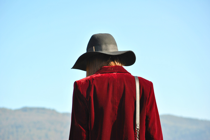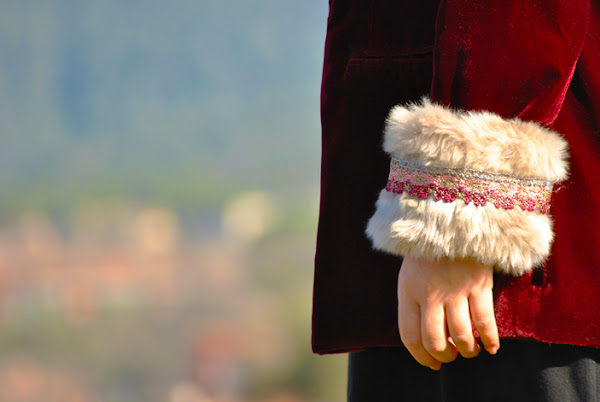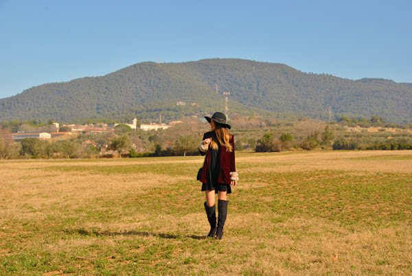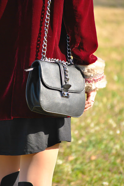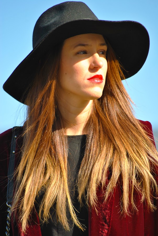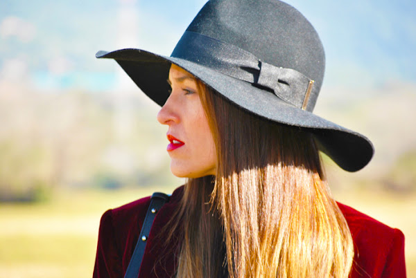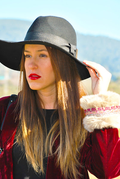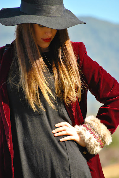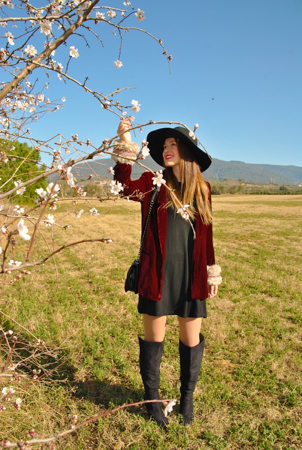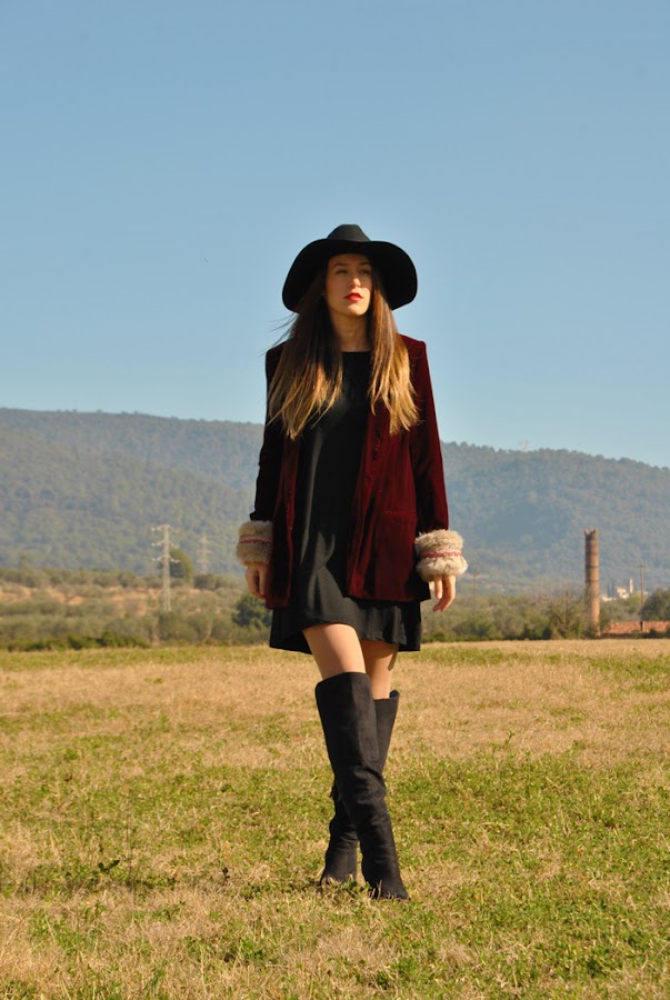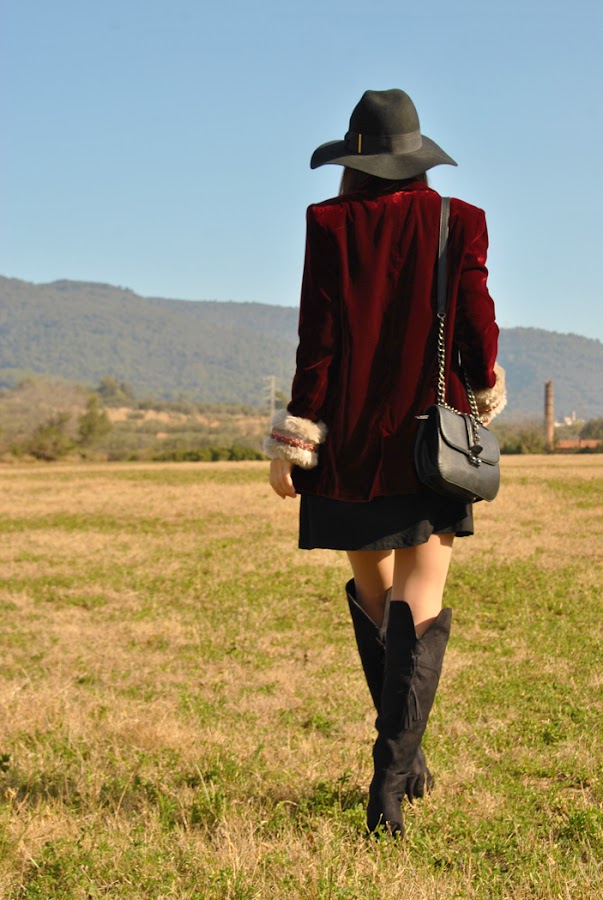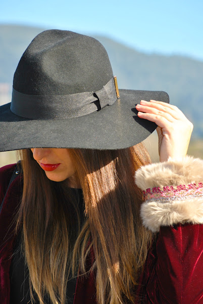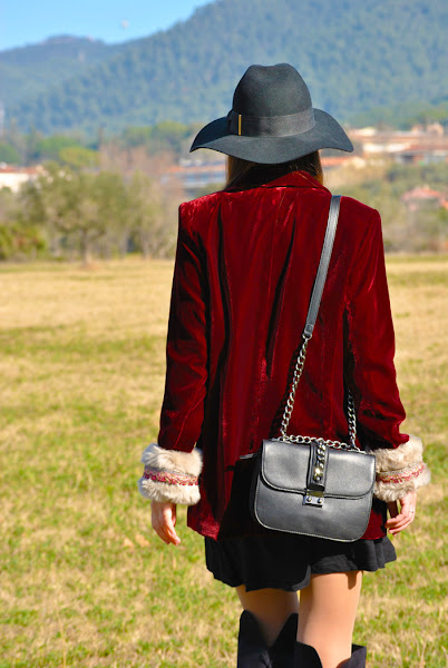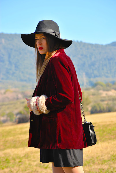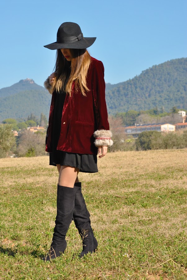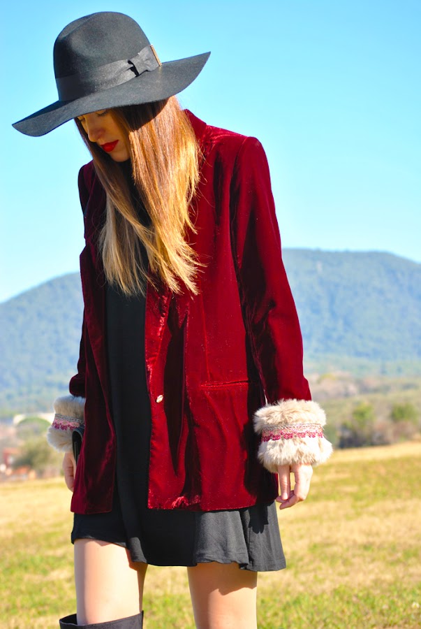 Buenas tardes chic@s! Damos la bienvenida a la primavera con un look fresco y desenfadado, os cuento: minivestido de vuelo combinado con botas XXL, bolsito negro y fedora todo en negro, pero que cobra vida con esta preciosa blazer de terciopelo granate masculina pero a la vez con un toque glam y que se convierte en la estrella de este outfit al añadirle los preciosos manguitos de pelo hechos a mano con detalles en granate y rosa, una moneria que conseguí en Mi&Ca. Los manguitos quedan genial con una camisa, jersey de punto o como en mi caso con la blazer pero ¡también se pueden utilizar como cubrebotas!