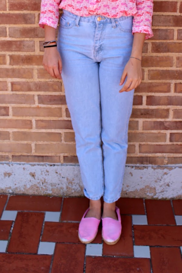 Creo que no he tomado mejor decisión en unos meses. Estos son de Stradivarius, aproveche una oferta donde tenían todos los jeans al -20%. Y cuando fui a comprarlos, ya me compré la camisa de flamencos que tenía fichada y es que es superdivertida para ahora. Entre que soy fan del color rosa y los flamenquitos.. Me encanta! Y de zapatos llevo estas alpargatas rosas que me compré hace año cuando fui a Menorca y pues les he sacado el polvo y me las he puesto, aunque quiero personalizarlas.