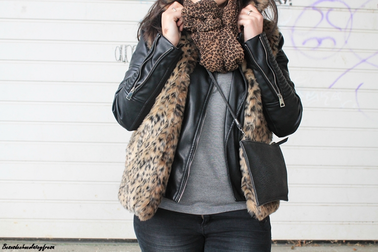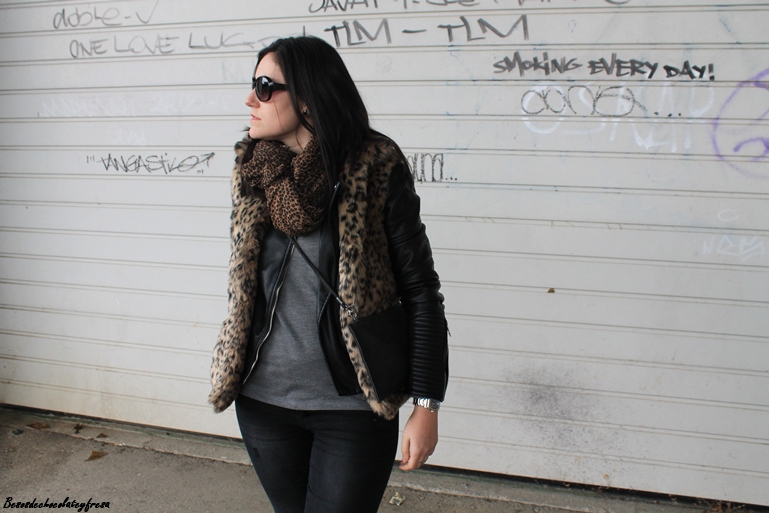 Hoy os traigo un look en tonos negros con un toque de animal print, que aprovechamos para fotografiar la semana pasada, para luego ir dar un paseo y tomar algo, plan de domingo relax. Para esta ocasión llevo jeans en negro con sweater en gris, slippers en charol y biker negros y luego el toque de animal print con el chaleco (que me encanta como queda con las chupas de cuero) y foulard del mismo tono.