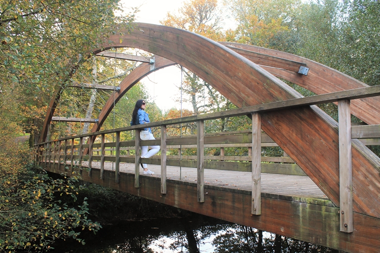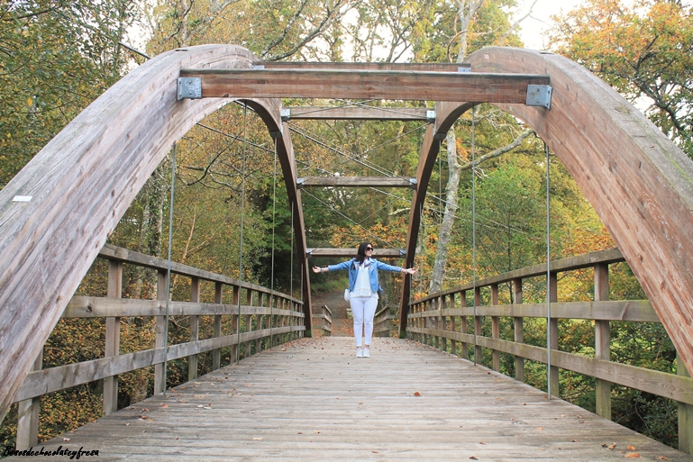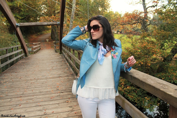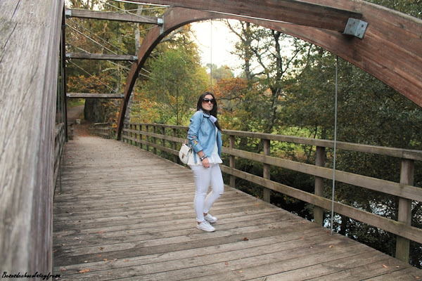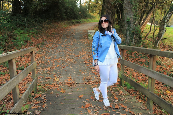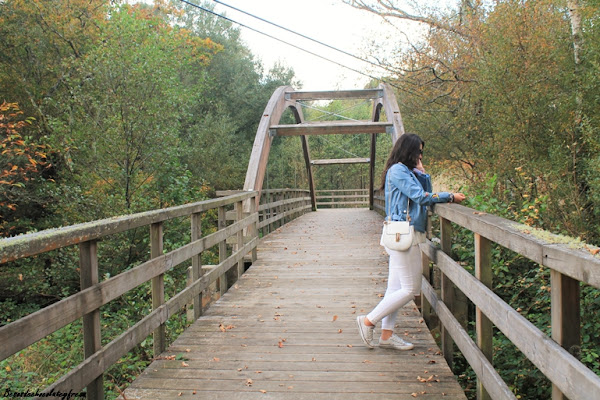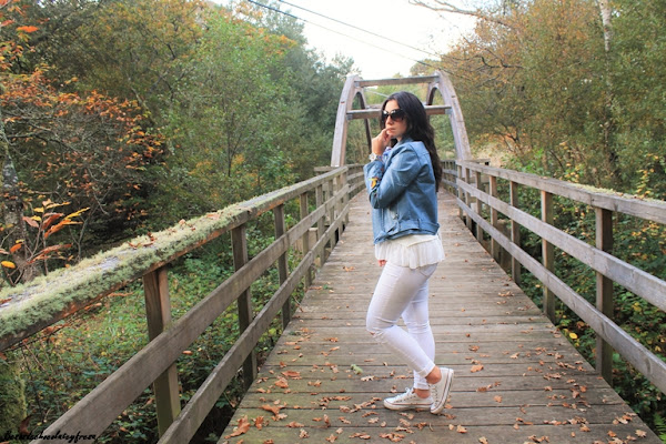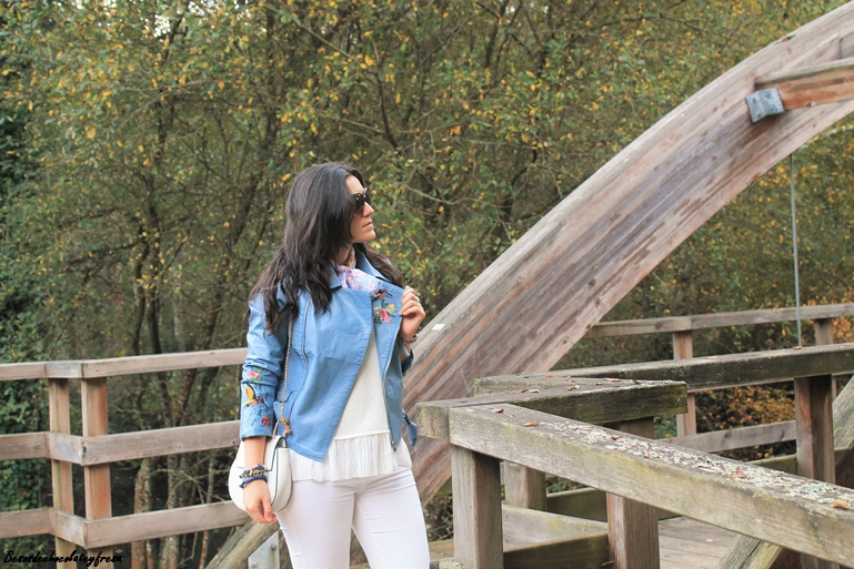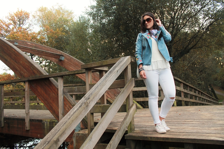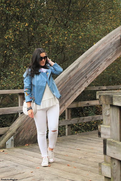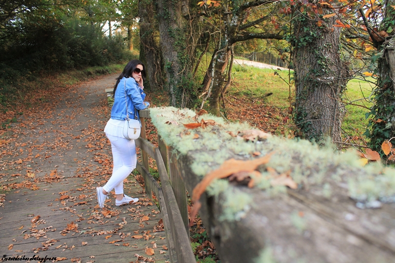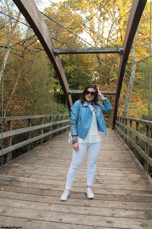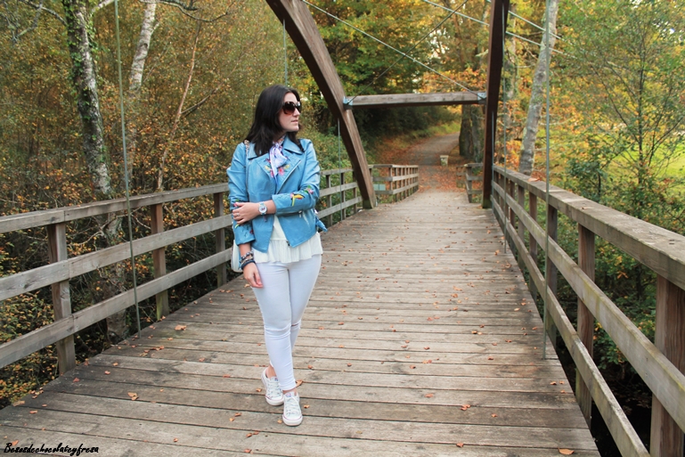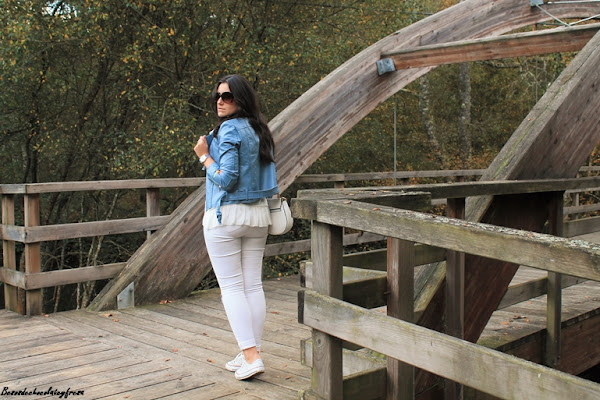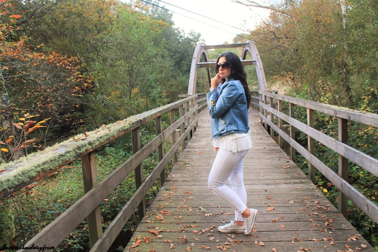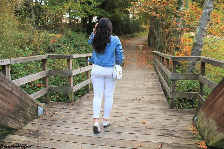 Decidí combinarla con un total white compuesto por camiseta de punto con volantes, jeans con rotos en las rodillas, sneakers y bolso blanco, aprovechando estos días de buen tiempo que estamos teniendo y que parece que ya se acaban. El lugar parece sacado de cuento, no hago más que ver ultimamente este tipo de puentes y cada vez que veo uno no me resisto a sacar fotos, este es en un paseo fluvial en el pueblo de Villalba, al que nos acercamos para pasar una tarde diferente y desconectar.