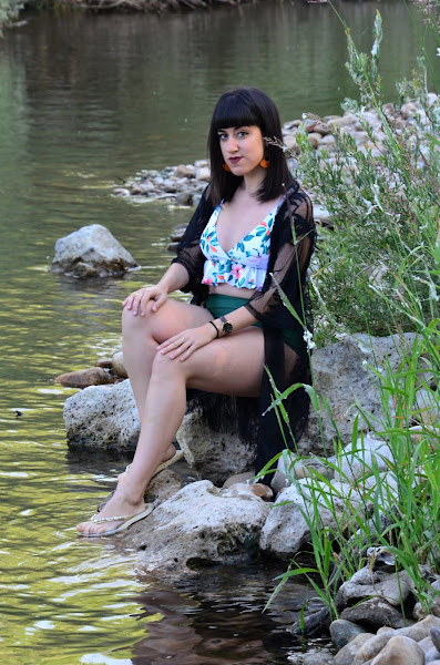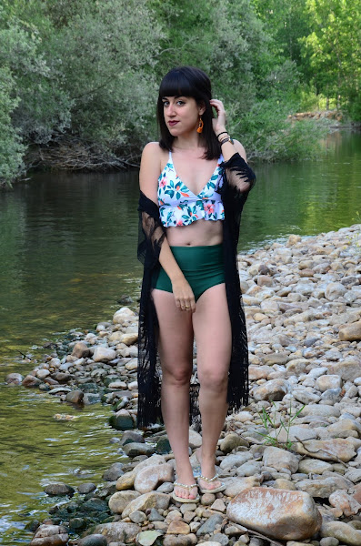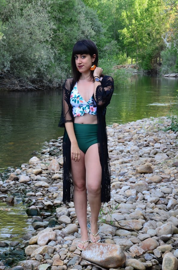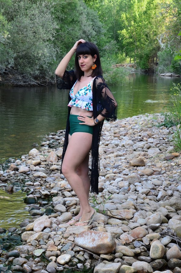 Hoy os enseño este bikini de estampado floral en el top y un verde botella en la braguita. Tiene ese estilo retro que tanto me gusta y los volantes del top le dan ese toque especial.