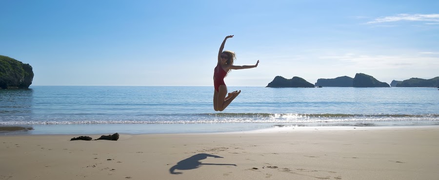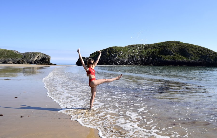Para lucir el bañador elegí un marco incomparable que es la playa de Borizo en Celorio, mi playa favorita, esta situada entre Barro y Celorio y cuando baja la marea aumenta considerablemente su tamaño dejando acceso a unas cuevas y caminando a un pequeño islote.