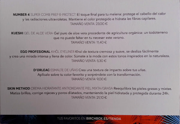 Me ha gustado mucho la crema de Skin Method, se adapta muy bien a mi tipo de piel y sus necesidades y estoy deseando probarla, es el producto que más me ha gustado pero trae muy poca cantidad. Respecto al esmalte, un rojo, me encantan los rojos para las uñas y estaba encantada hasta que descubrí que era de efecto craquelado, no me gusta nada y no creo que le de uso, una pena. Fue un detalle que nos dejaran elegir el tono del lápiz de ojos, creo que los tonos en el maquillaje es algo bastante personal y siempre es un plus que podamos escoger. Por otro el acondicionador sin aclarado de Number 4 no me llama la atención, me parece muy caro para el tipo de producto que es y aunque llegue a gustarme (aún no lo he probado), no creo que invierta en él. Por último os menciono el gel de aloe vera, tengo alguno más y es un producto al que yo no suelo sacar demasiado partido, lo aplico cuando me hago alguna rozadura o me quemo, también lo vería útil como aftersun pero yo no suelo tomar el Sol habitualmente.